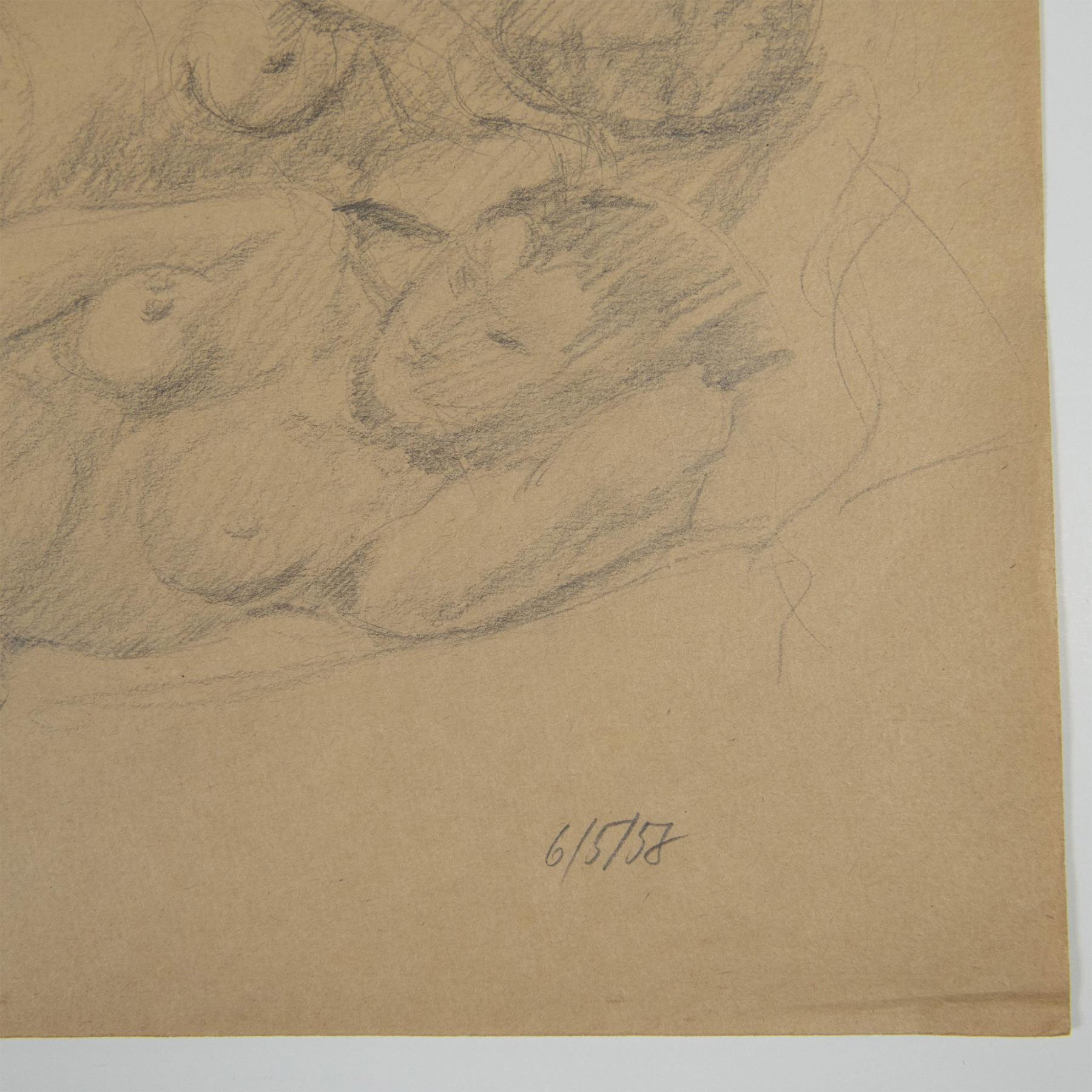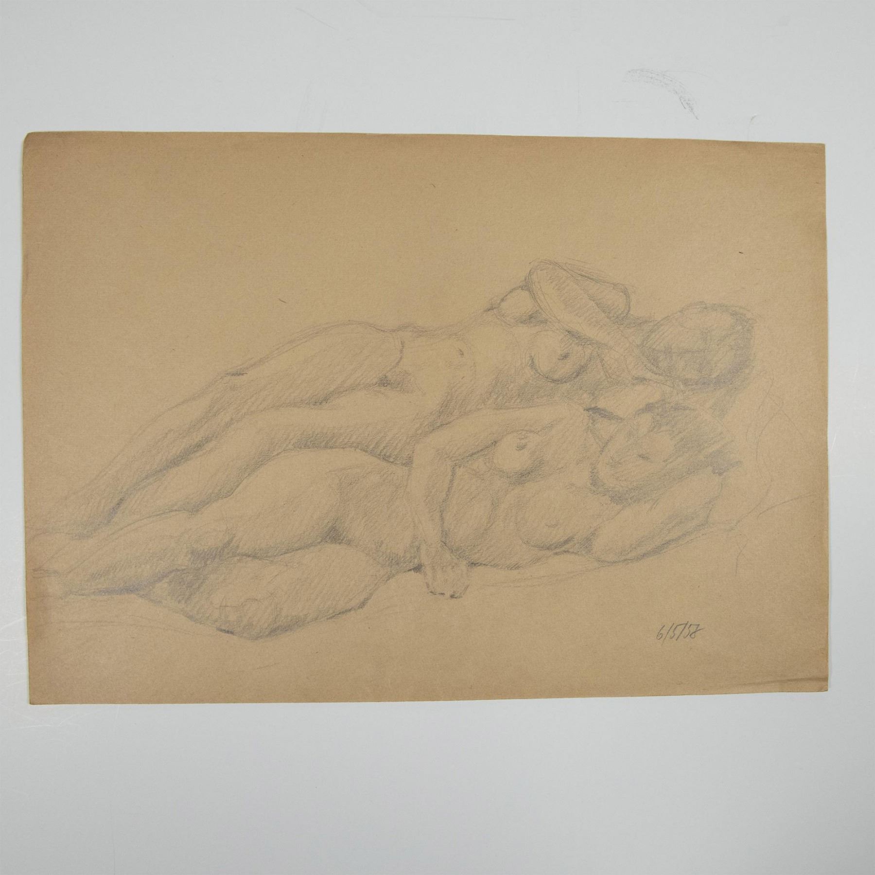 Original pencil drawing on beige laid paper. Capturing a tender and intimate moment between nude lovers lying in bed. The soft, delicate lines convey a sense of peaceful surroundings and gentle affection. Dated in graphite on lower right corner: 6/5/58.
