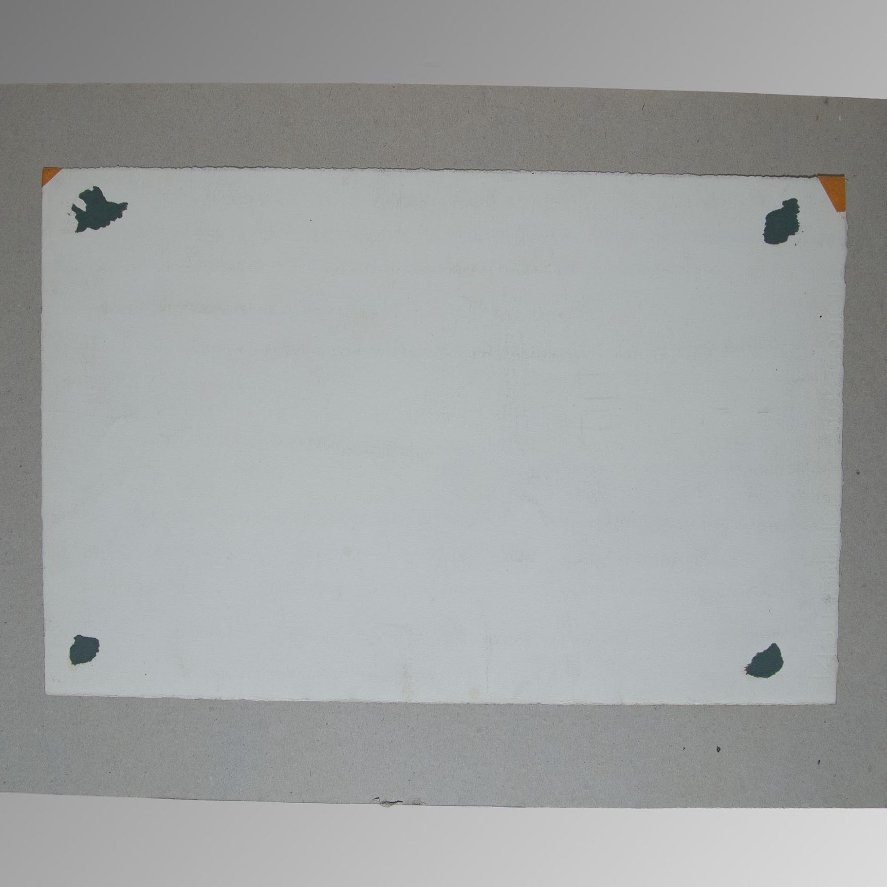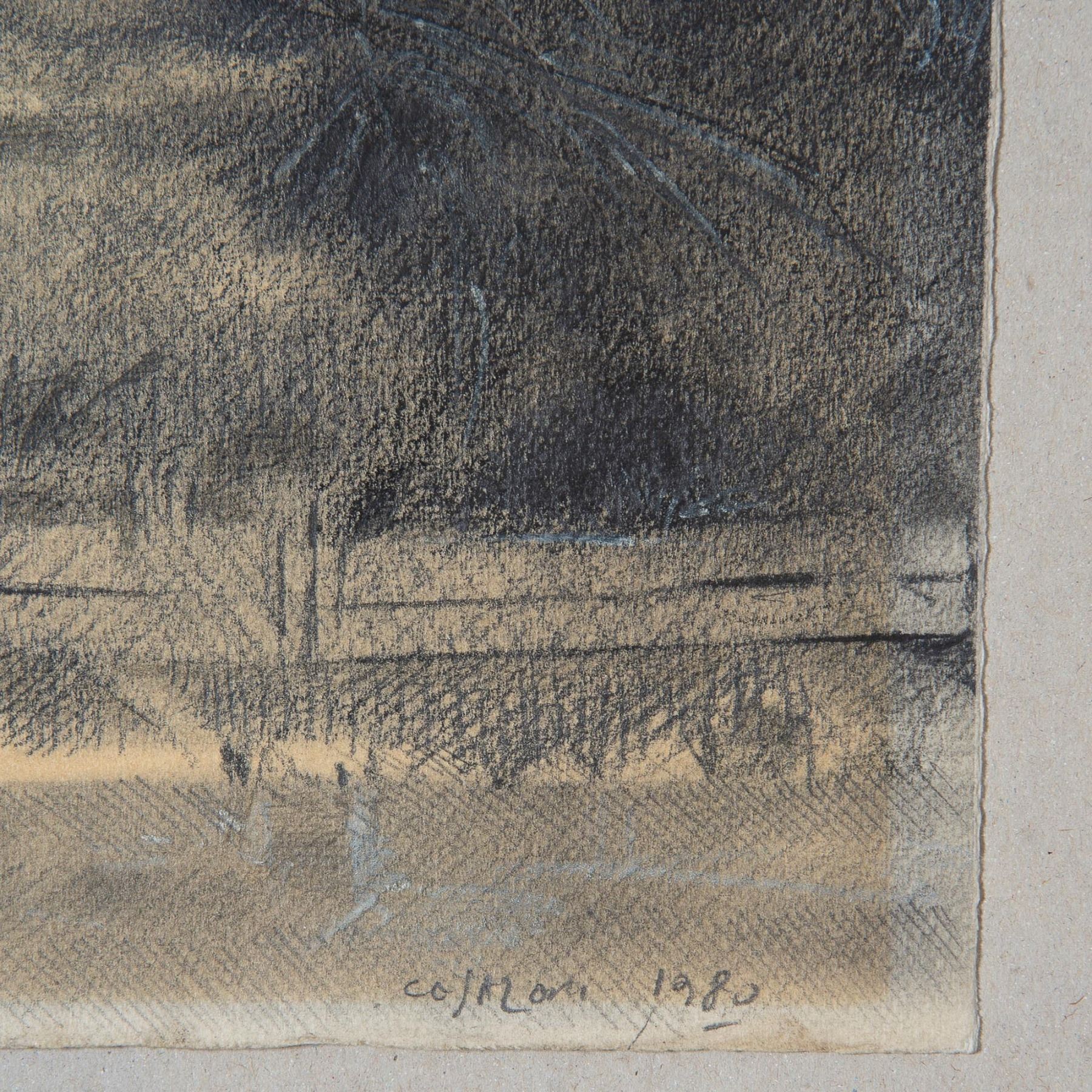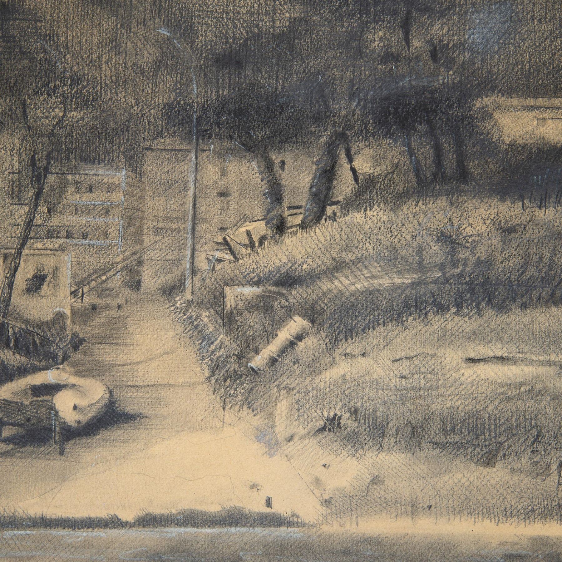 Original graphite and wash on paper that depict a zodiac boat near oil barrels scattered in an overgrown industrial landscape with dwellings. Signature and date in graphite on lower right: Colazori? 1980. Artwork dimensions: 19"L x 13.25"H. Mat size: 24"L x 18"H.