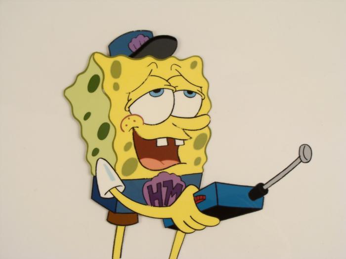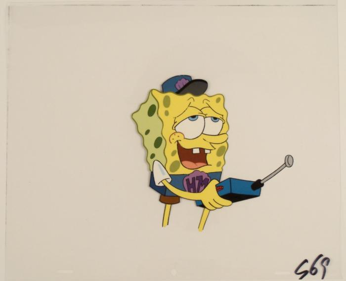 This original animation cel is from the Nickelodeon TV show SpongeBob Squarepants. The story takes place under the deep blue sea in Bikini Bottom, where SpongeBob resides. SpongeBob, who is a yellow, porous sponge, is your typical happy-go-lucky character, as he is always cheerful and enjoys making people laugh. Patrick Star, SpongeBob's neighbor who is a starfish, is your average children's show idiot, as he boasts knowing nothing and is often getting himself into ridiculous situations. Between the homes of these two lies the home of the miserable Squidward, a squid, who is known for being grouchy and playing tricks on SpongeBob and Patrick. Both SpongeBob and Squidward work at the Krusty Krab, a fast food business run by the greedy money-loving Mr. Krabs, a crab, the arch rival of the evil, possibly misunderstood, Plankton. Another neighbor, Sandy Cheeks, an athletic squirrel who normally wears an astronaut's space suit, was introduced in "Tea at the Treedome." She spends most of her time inventing and experimenting. SpongeBob is a great hall monitor.Original Production Animated Cel Overall Size of Cel: 10 1/2" x 12 1/2" Very Good ConditionThis is an original hand-painted cel set-up used in the production of an episode of "SpongeBob SquarePants." Each one-of-a-kind set-up represents a slight change in position of the characters. When individually photographed and projected in rapid succession, the images appear to move.