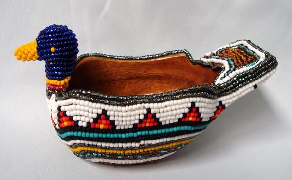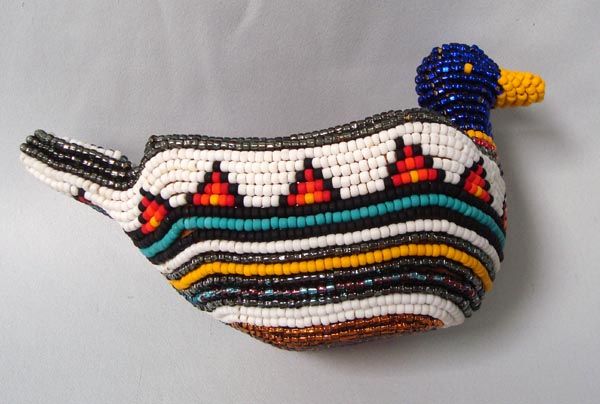 Original Hand Beaded Wooden Duck-Kills Thunder. Approximately 4.5''H x 8''L x 4''W. Vibrant bead work on this adorable duck.