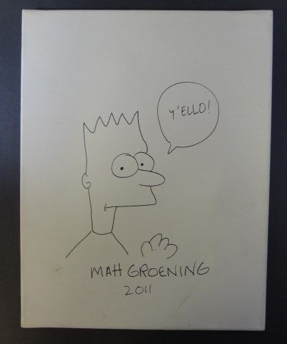 14" x 18" x 1/2" (no frame) white canvas with Simpson Sketch (in black sharpie) / signed by Matt Groening 2011. No COA. Est. Value $375.00 - $500.00.