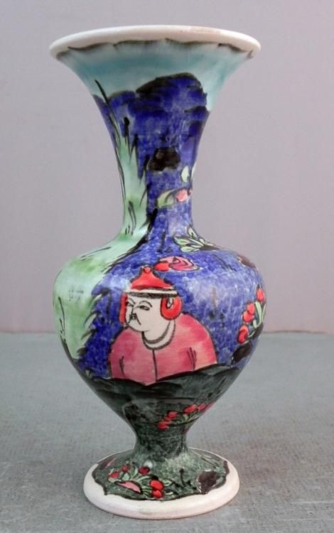 This vase has a hand painted scene of men in the forest under a blue sky. The underside is signed by the artist, and marked with name and numbers. The size is 6 inches tall. The condition is excellent. * * It is more unusual to find pottery of this type, and this is an especially nice example.
