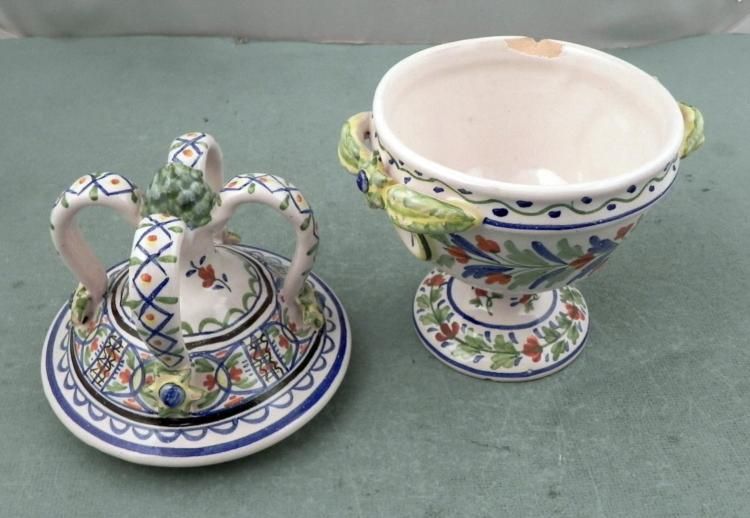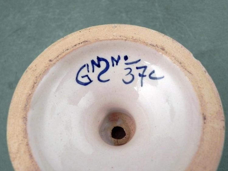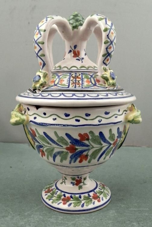 This lidded pededstal urn has a hand painted floral pattern in blue, red, and green, and fancy four band top, with stars. The underside is signed GMN 37c. The dimensions are 10 inches tall, and 6 1/4 inches wide. The condition is very good, and although there's a chip on the inside lip, it is not visible with the lid on. * * This is a nice traditional urn with a rural style.