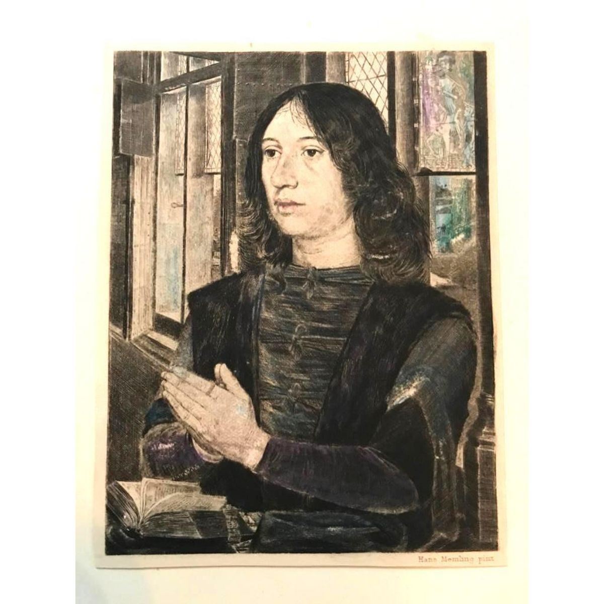 Original French intaglio etching by Coppier, Andre-Charles ( 1868-1948 ). After the original 1487 diptych painting attributed to Hans Memling, this image was the right side of the Early Netherlandish devotional diptych depicting the donor of the artwork, Maarten van Nieuwenhove (11 November 1463 - 16 August 1500 ) a wealthy gentleman from a noble family of Bruges with connections at the court of Burgundy. In the 1490s, Van Nieuwenhove was successively a city councilor, the captain of the civic guard, & in 1498 mayor of Bruges. The left side of the original artwork depicted Memlings "Virgin & Child". Hans Memling ( also spelled Memlinc; c. 1430 – 11 August 1494) was a German painter who moved to Flanders & worked in the tradition of Early Netherlandish painting. He was born in the Middle Rhine region, & probably spent his childhood in Mainz. He had moved to the Netherlands by 1465 and spent time in the Brussels workshop of Rogier van der Weyden. He was subsequently made a citizen of Bruges, where he became one of the leading artists in which he painted religious works that often incorporated portraits of his wealthy patrons. Memling's patrons included wealthy burghers ( bankers, merchants, & politicians), clergymen, & aristocrats. Â