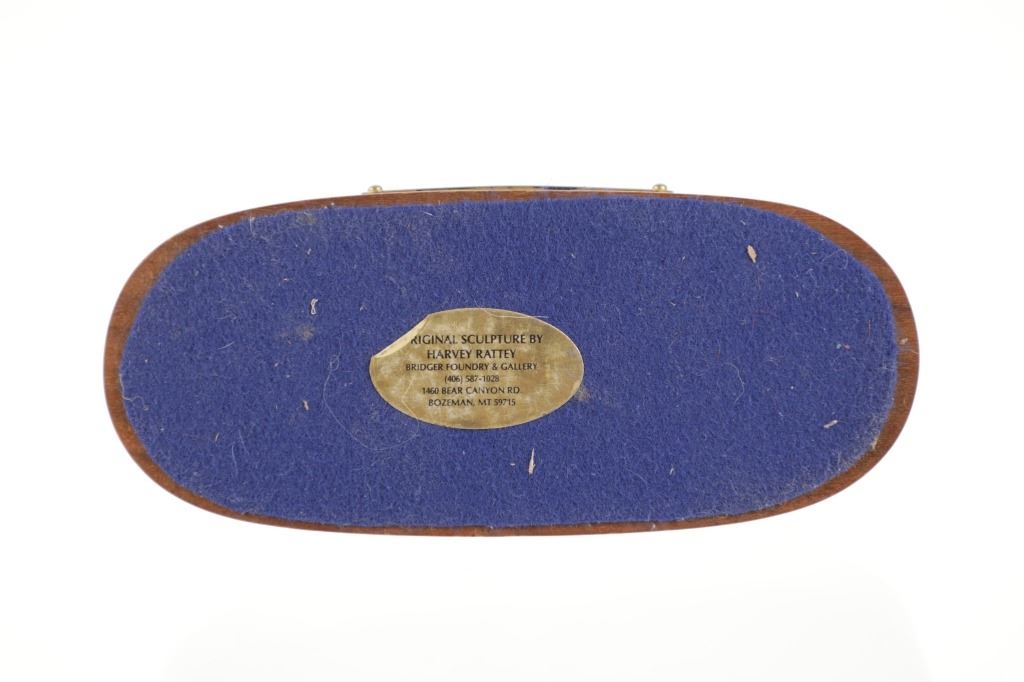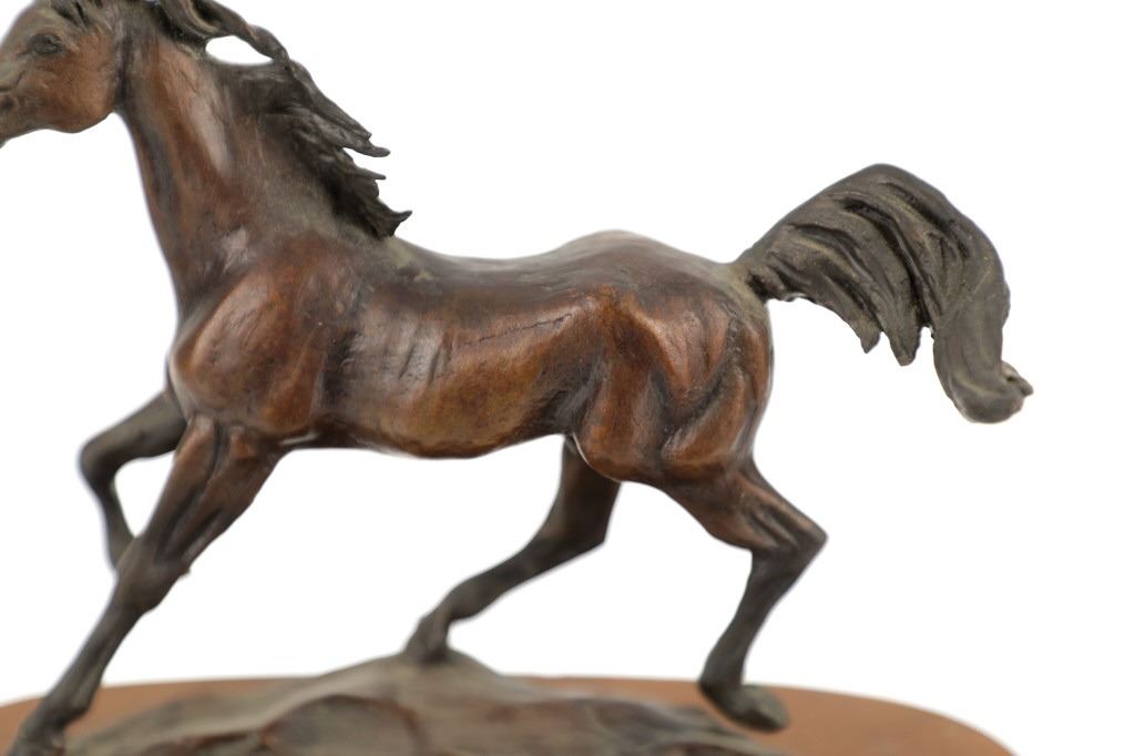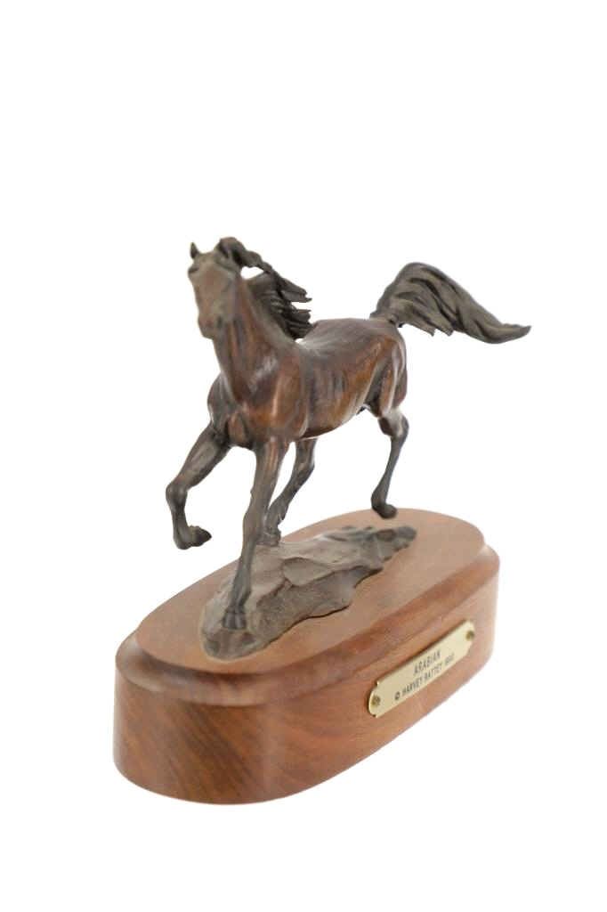 Featured in this lot is this original Harvey Rattey bronze sculpture called "Arabian" circa 1990. The bronze sculpture features a wonderfully and professionally crafted Arabian Horse that is constructed from bronze and is marked "Arabian Horse" and is marked "1/200 copyright Harvey Rattey 1990." and features a brass plaque with the title and the artist clearly stated with the creation date. The condition of this bronze sculpture is good with no obvious signs of damage and shows good overall condition. The measurements of this bronze sculpture is 6 1/2" x 7 1/2" x 3 1/4".