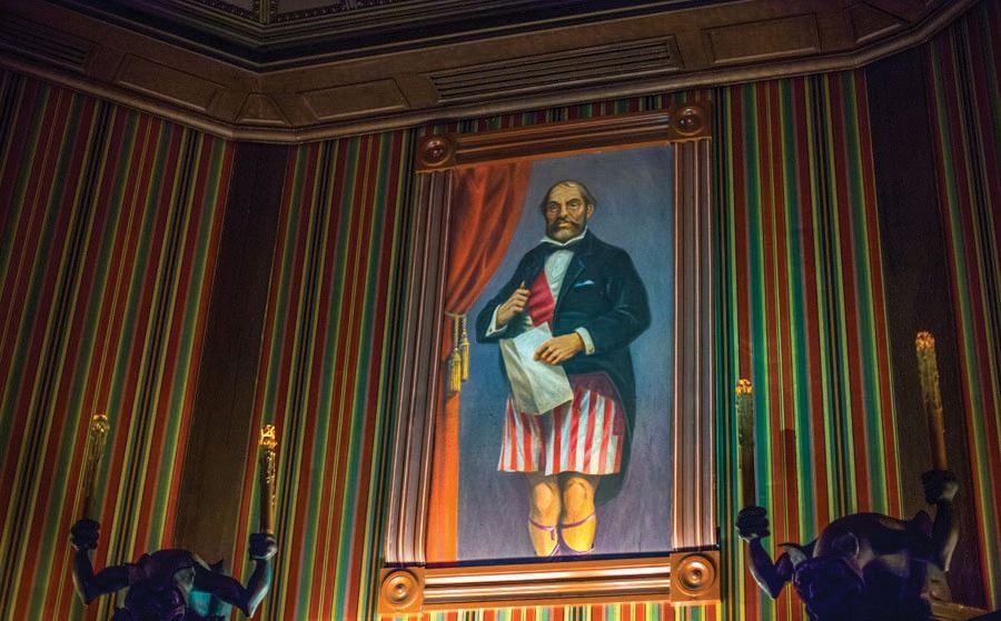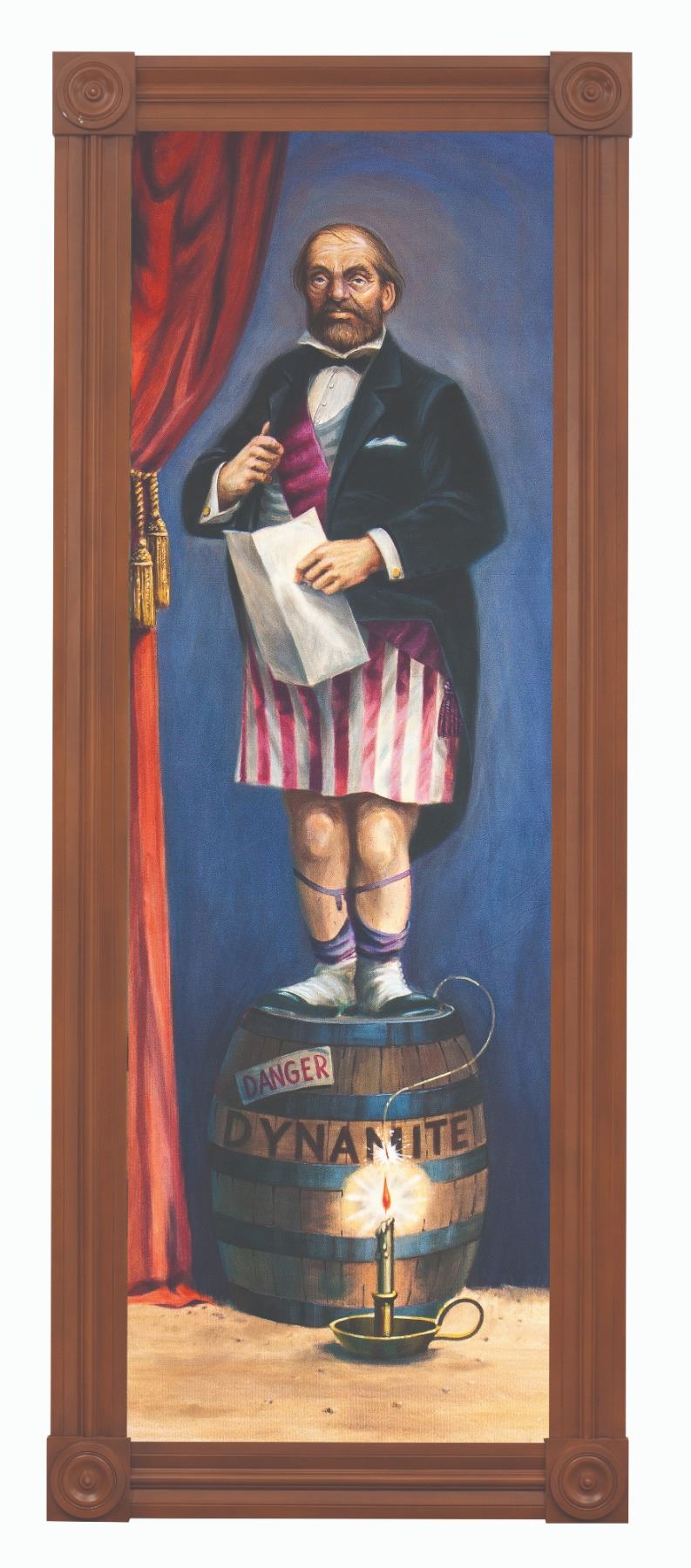 (Disneyland, .1969-70s) An original hand-painted stretching portrait on canvas used within Disneyland's Haunted Mansion attraction. As the elevator descends, the portraits would "stretch" to reveal their full image. However, the consistent "stretching" would eventually cause some wear to the canvas, and these portraits would need to be replaced. In the early years of the attraction, the portraits were all hand-painted with imagery designed by Imagineer Marc Davis, whereas later versions were printed. This stretching portrait depicts the man standing on a barrel of dynamite. The canvas is sealed in its frame measuring 46"x105.5", with visible area of 36"x95.5" showing. The portrait is in very good condition with some wear from original use. These portraits are exceptionally rare and sought-after artifacts from the earliest years of the Haunted Mansion.