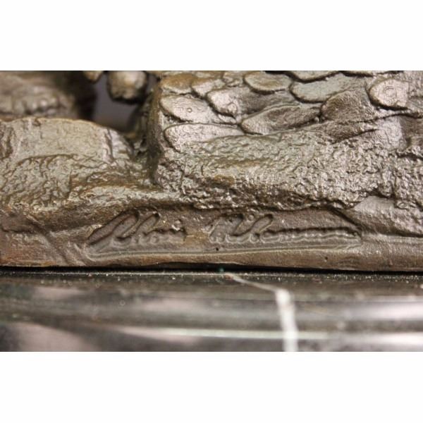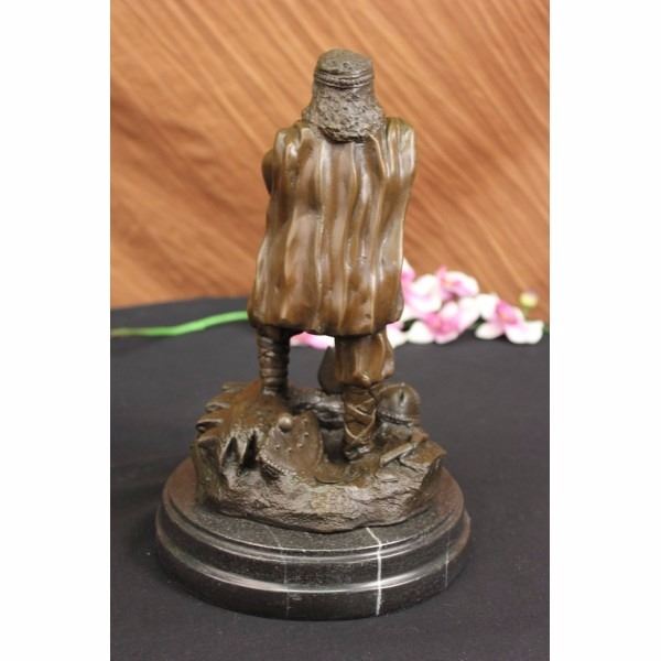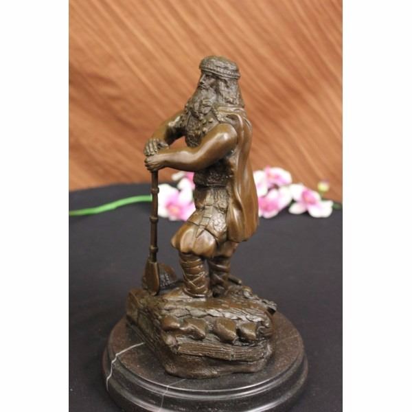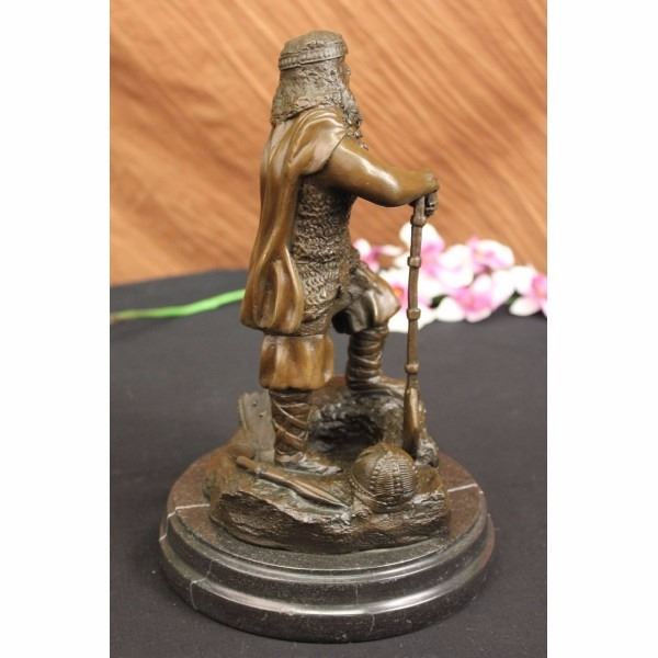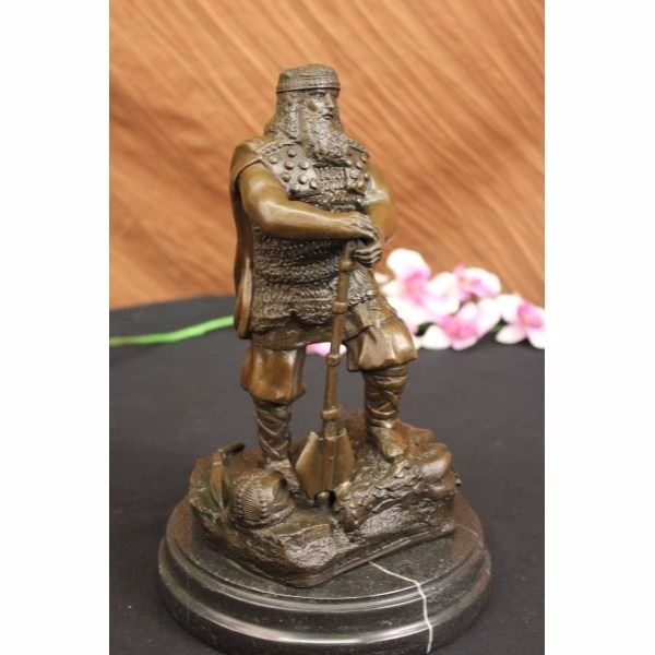 Known for their heavy armor, and powerful brute strength a Viking Huscarl gained respect among Europeans. This Norseman stands proudly digging his two-sided axe into the ground and stepping one foot a level higher in the signature pose of power and pride. Fully outfitted in armor, shoes, and a cape this warrior has all the elements of a great fighter. This 100% bronze sculpture was crafted using the lost wax method. The piece stands on a circular black marble base. It is signed Chris Miles. Condition : This sculpture is in perfect condition. Bronze Dimensions with Marble Base:Height 12" x Width 8" Marble Dimensions: Diameter 8". Height without base: 11" Weight : 13 LBS Inventory:64DSDS5138546