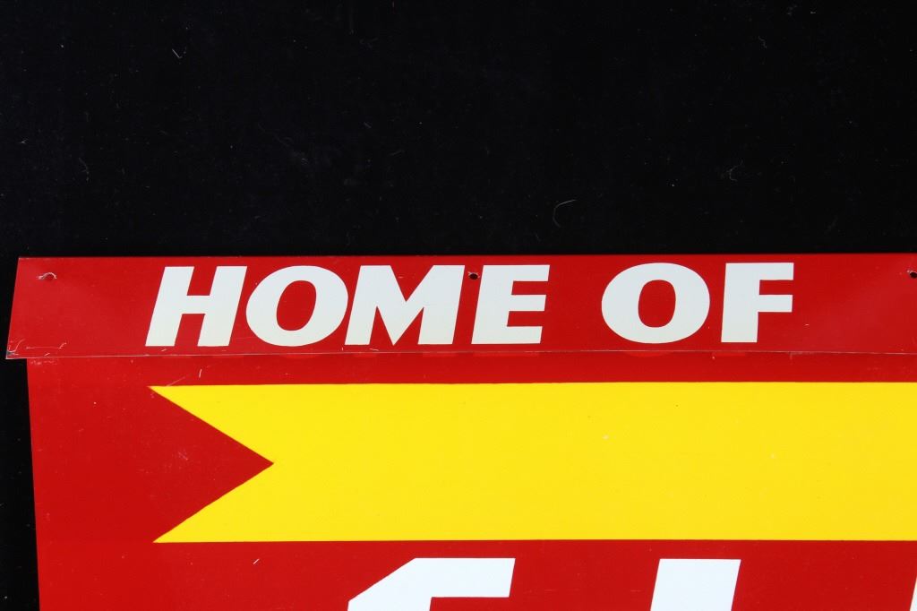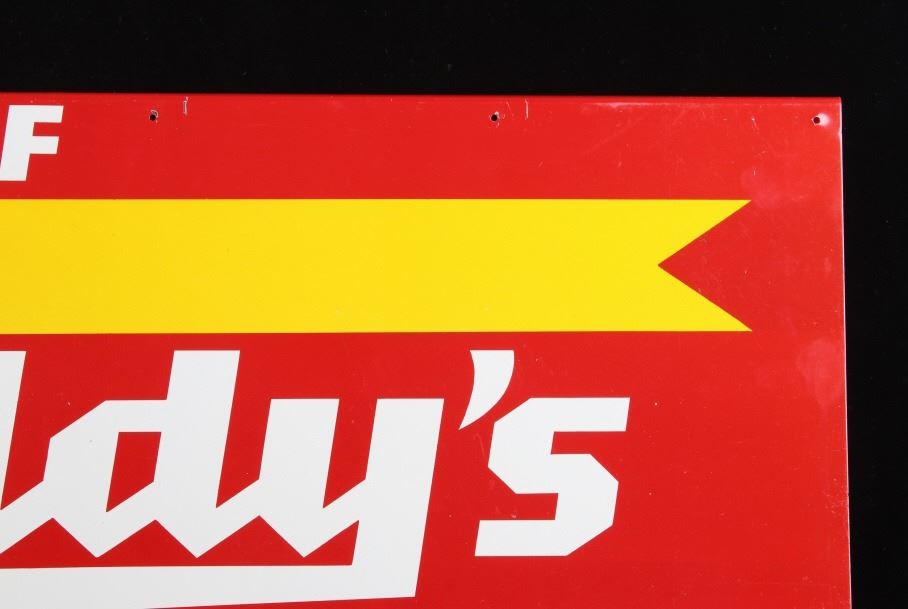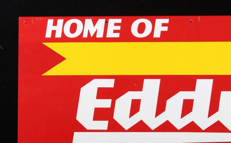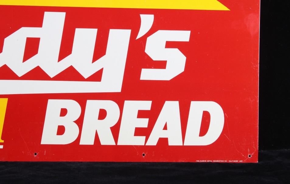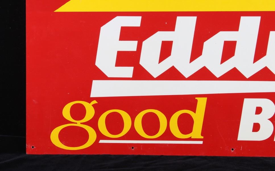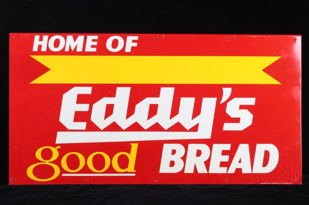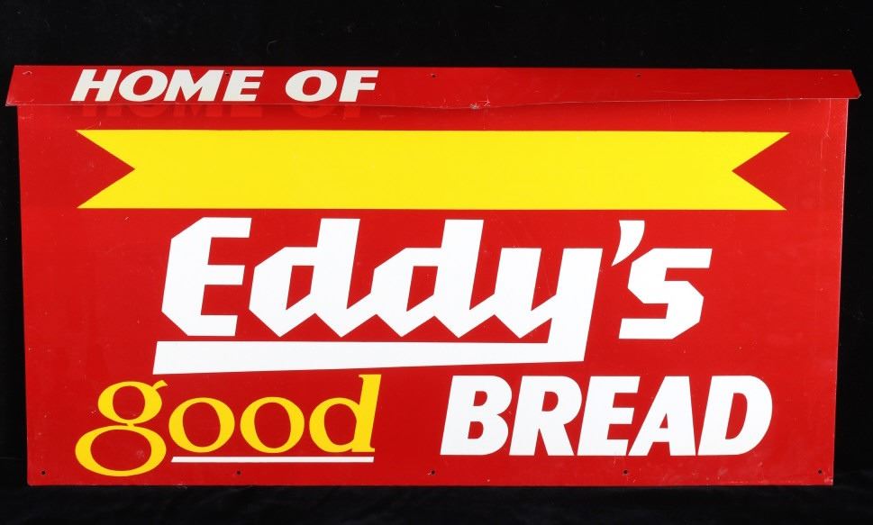 Included in this lot is an original Eddy's Good Bread metal sign originating from the early 20th century. J.E. "Eddy" O'Connell has a long history of entrepreneurship with the city of Helena MT, as well as the whole Northwest, with bakeries across the entire Northwest. This sign shows a red field with yellow and white lettering reading, "Enjoy Eddy's good Bread"; the bottom right corner shows the sign MFG information. This double-sided sign shows good condition overall, with some minor wear due to age. The piece measures 29" wide by 15 1/4" tall.