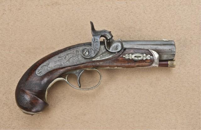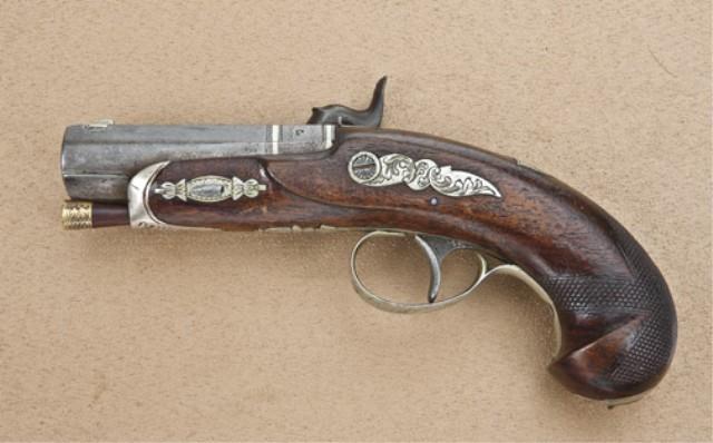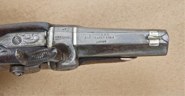 Original Henry Deringer percussion pistol, agent marked C. Curry San Franco Cala Agent". .46 caliber 7-groove rifle barrel double silver banded at breech with typical engraved silver mounts deluxe capbox in butt pineapple finial ,with original brass tipped removable ramrod. Brass surfaces show a lightly cleaned grey patina