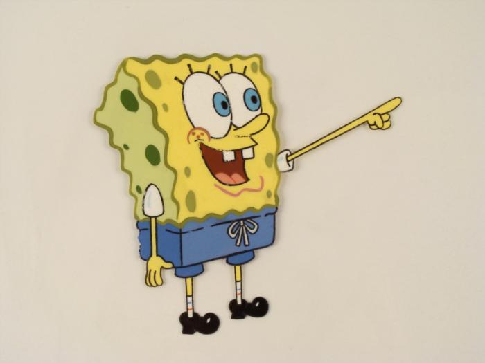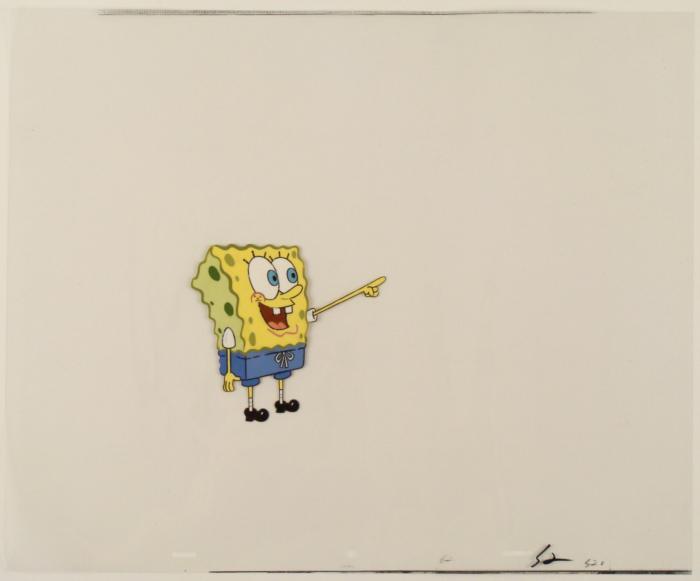 This original animation cel is from the Nickelodeon TV show SpongeBob Squarepants. The story takes place under the deep blue sea in Bikini Bottom, where SpongeBob resides. SpongeBob, who is a yellow, porous sponge, is your typical happy-go-lucky character, as he is always cheerful and enjoys making people laugh. Patrick Star, SpongeBob's neighbor who is a starfish, is your average children's show idiot, as he boasts knowing nothing and is often getting himself into ridiculous situations. Between the homes of these two lies the home of the miserable Squidward, a squid, who is known for being grouchy and playing tricks on SpongeBob and Patrick. Both SpongeBob and Squidward work at the Krusty Krab, a fast food business run by the greedy money-loving Mr. Krabs, a crab, the arch rival of the evil, possibly misunderstood, Plankton. Another neighbor, Sandy Cheeks, an athletic squirrel who normally wears an astronaut's space suit, was introduced in "Tea at the Treedome." She spends most of her time inventing and experimenting. SpongeBob is saying, "Hey, Look!"Original Production Animated Cel Overall Size of Cel: 13 1/2" x 16 1/2" Very Good ConditionThis is an original hand-painted cel set-up used in the production of an episode of "SpongeBob SquarePants." Each one-of-a-kind set-up represents a slight change in position of the characters. When individually photographed and projected in rapid succession, the images appear to move.