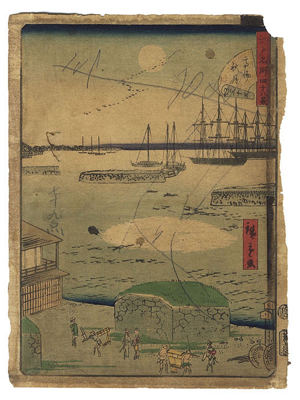 Original Hiroshige II (1826 - 1869) Japanese Woodblock Print, 8 7/8" x 6 1/2" + margins as shown, This print with nice detail as shown. Some staining. Repaired. See photo for details