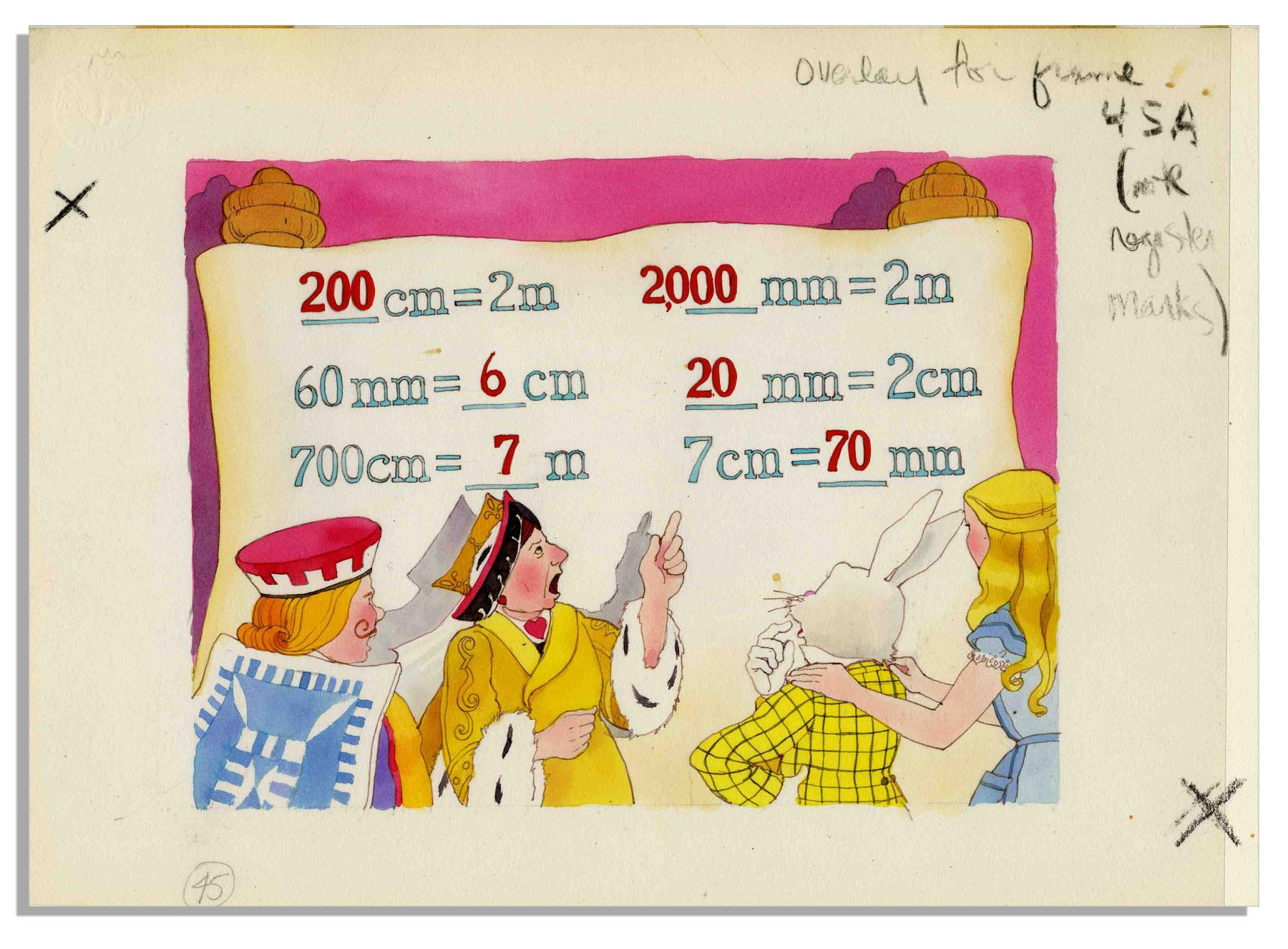 Finely detailed watercolor from the ''Holt Metric Filmstrips: The Further Adventures of Alice & Meter Rabbit'' series, copyright 1978. Holt Metric Filmstrips were developed as a teaching tool for students, combining cassettes and filmstrips. Colorful painting displays mathematical conversion questions and depicts characters from ''Alice in Wonderland'' including Alice, the Rabbit, and the Queen and is numbered ''45'' in pencil. Includes an overlay transparency with answers to the questions. Painting measures 11.5'' x 9''. Fine condition.