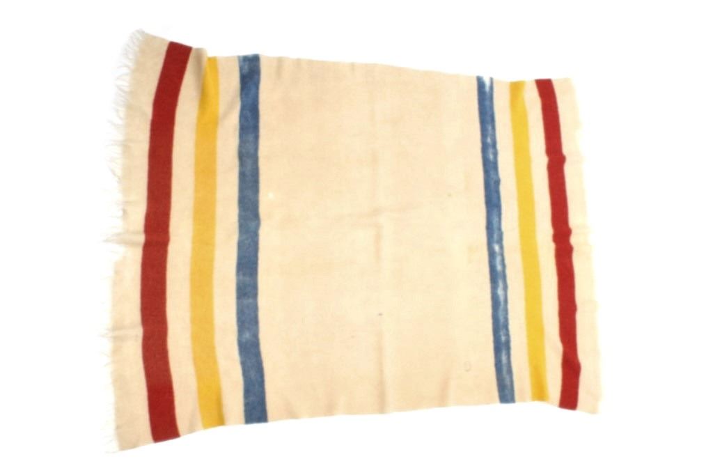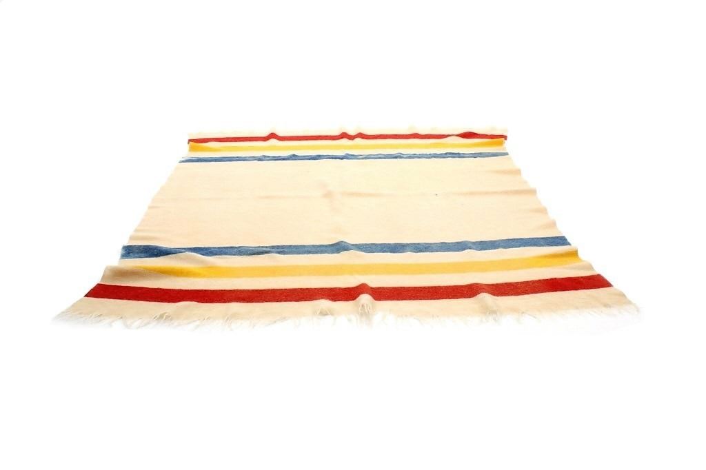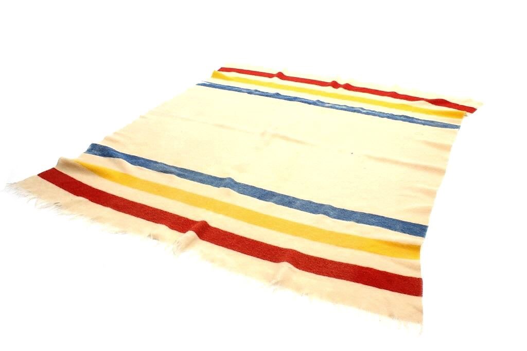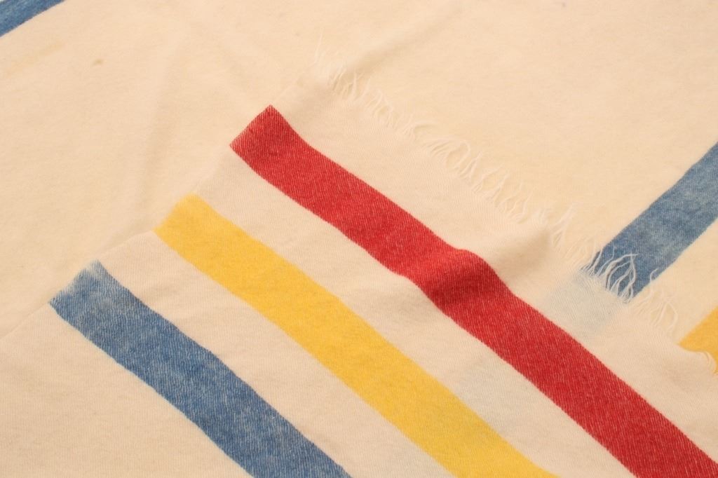 For your consideration is this Hudson Bay Company trade wool blanket. This blanket is striped with the company’s iconic green, yellow, red, and blue stripes and shows a pleasant wool construction. The blanket shows tight construction with some sections showing a long fringe across the top and bottom. The blanket shows fair condition overall with some wear and damage across the piece. The blanket measures 69" wide by 78" long.
