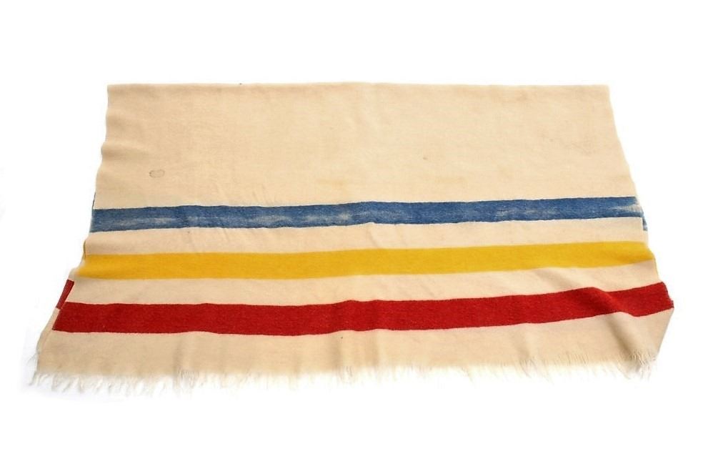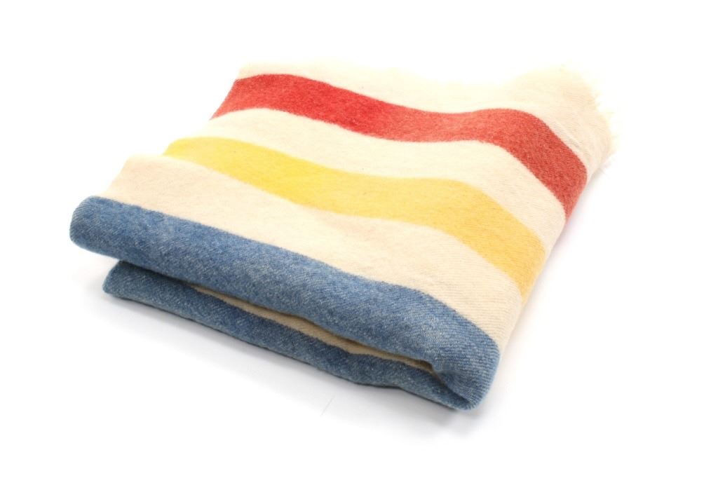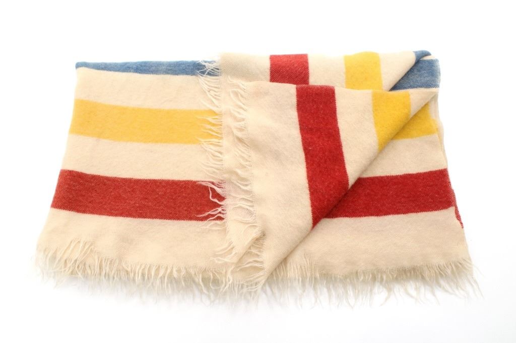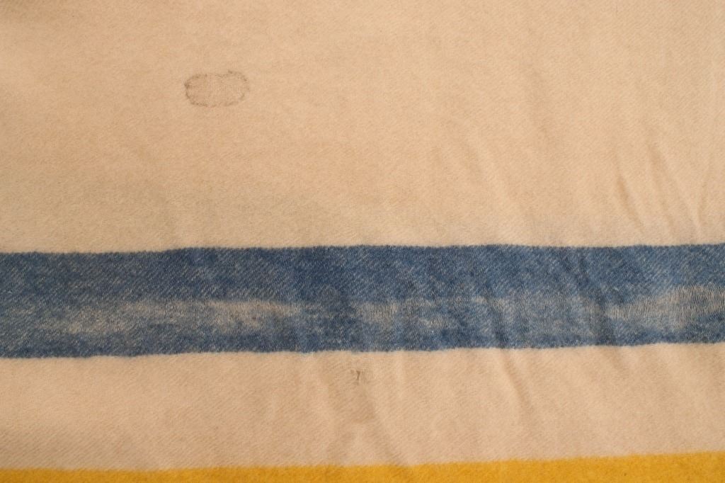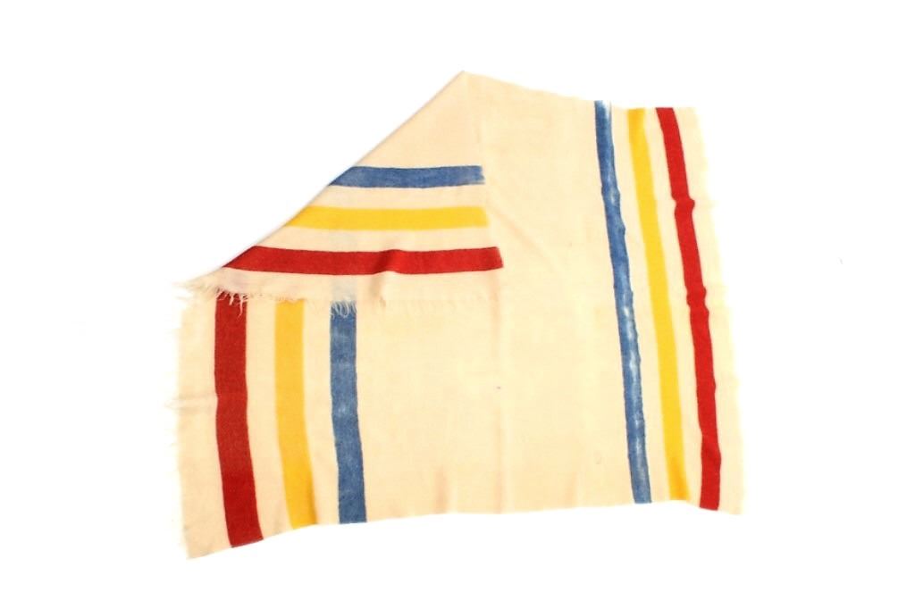 For your consideration is this Hudson Bay Company trade wool blanket. This blanket is striped with the company’s iconic green, yellow, red, and blue stripes and shows a pleasant wool construction. The blanket shows tight construction with some sections showing a long fringe across the top and bottom. The blanket shows fair condition overall with some wear and damage across the piece. The blanket measures 69" wide by 78" long.
