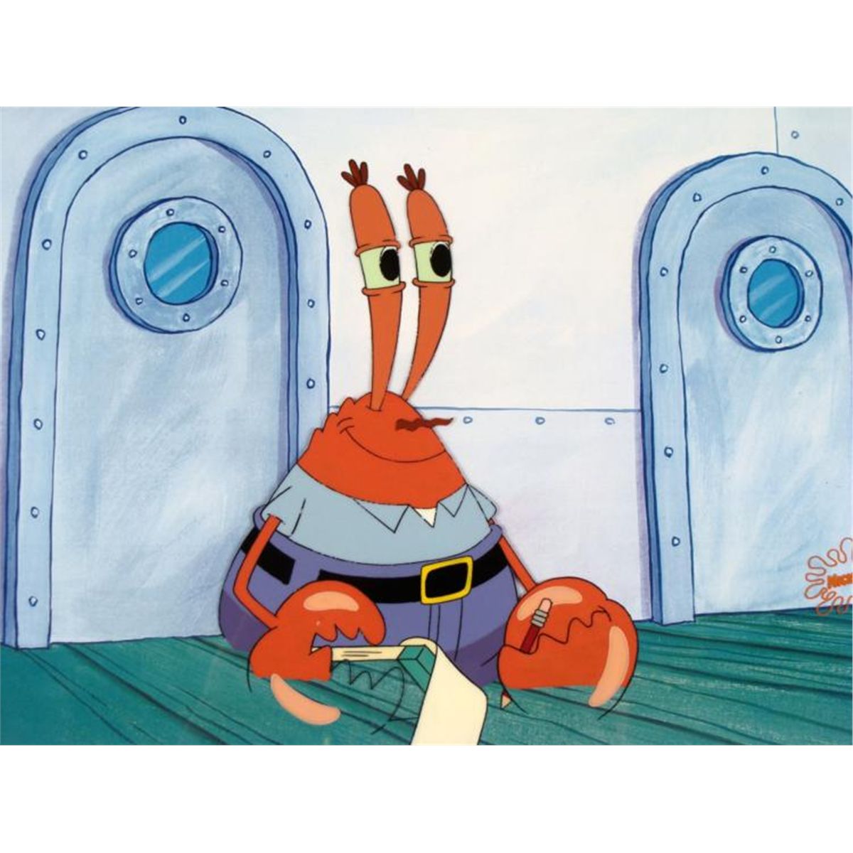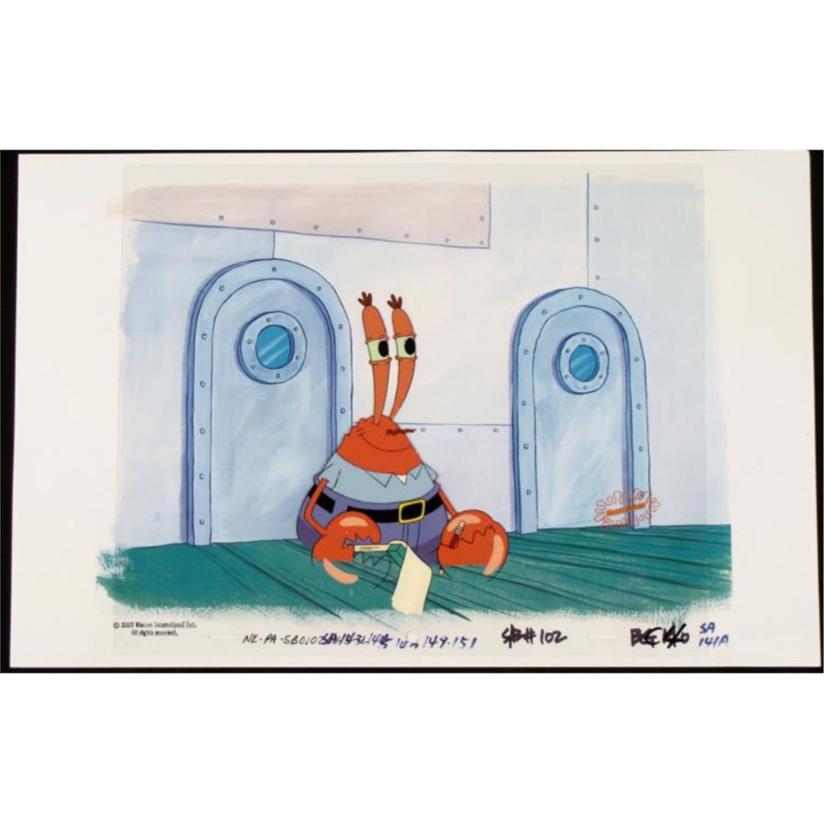 This animation cel and reproduction background are from the Nickelodeon TV show SpongeBob Squarepants. The story takes place under the deep blue sea in Bikini Bottom, where SpongeBob resides. SpongeBob, who is a yellow, porous sponge, is your typical happy-go-lucky character, as he is always cheerful and enjoys making people laugh. Patrick Star, SpongeBob's neighbor who is a starfish, is your average children's show idiot, as he boasts knowing nothing and is often getting himself into ridiculous situations. Between the homes of these two lies the home of the miserable Squidward, a squid, who is known for being grouchy and playing tricks on SpongeBob and Patrick. Both SpongeBob and Squidward work at the Krusty Krab, a fast food business run by the greedy money-loving Mr. Krabs, a crab, the arch rival of the evil, possibly misunderstood, Plankton. Another neighbor, Sandy Cheeks, an athletic squirrel who normally wears an astronaut's space suit, was introduced in "Tea at the Treedome." She spends most of her time inventing and experimenting. * * I love my job... * * Original Printed Background and Animated Cel Overall Size of Background: 11" x 17" Overall Size of the Cel: 10 1/2" x 12 1/2" Very good condition This is an original hand-painted cel set-up used in the production of an episode of "SpongeBob SquarePants," titled Squeaky Boots. Each one-of-a-kind set-up represents a slight change in position of the characters. When individually photographed and projected in rapid succession, the images appear to move. * To create production cels, the original animator's drawing is transferred onto an acetate cel (by hand-inking and/or photo copying). The cel is then hand-painted on the reverse side. The background accompanying this set-up is a reproduction background. * * The printed background and cel are ready to be matted and framed. The notations are located at the bottom of both. The Nickelodeon logo is located at the bottom right of the cel. There is some slight paint fade to Mr. Krab's outline. *
