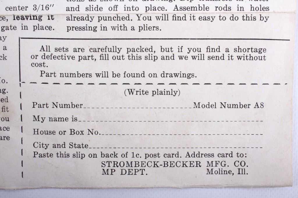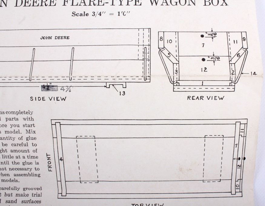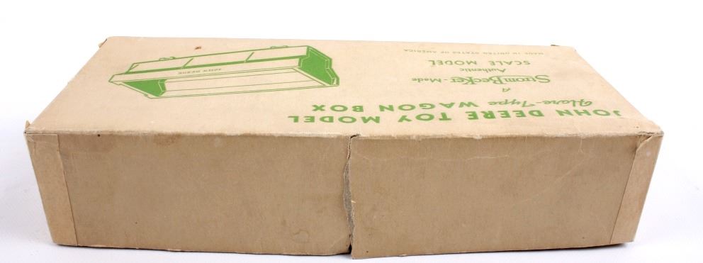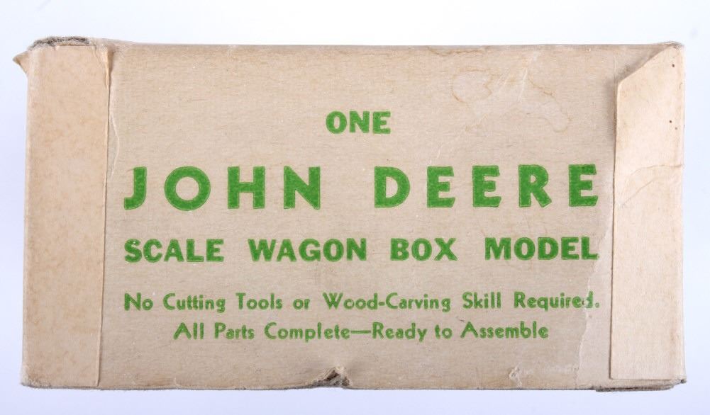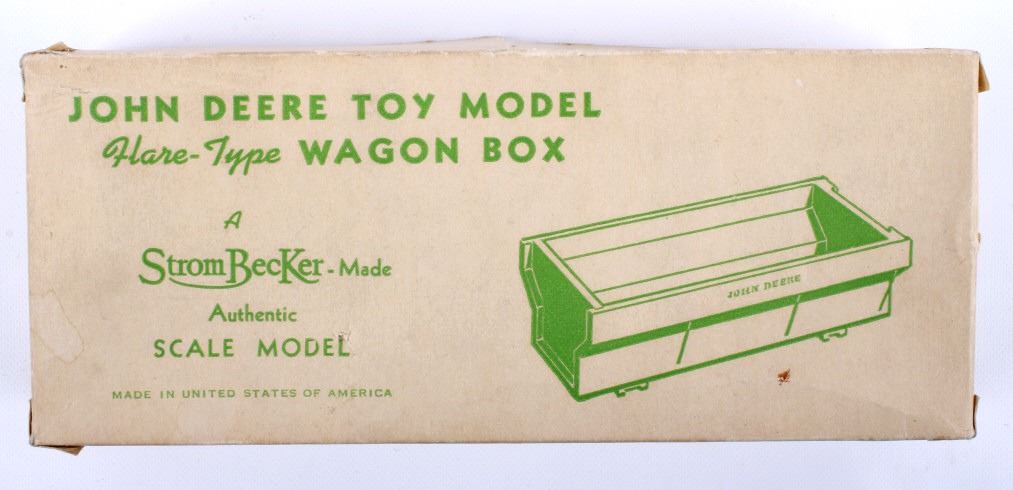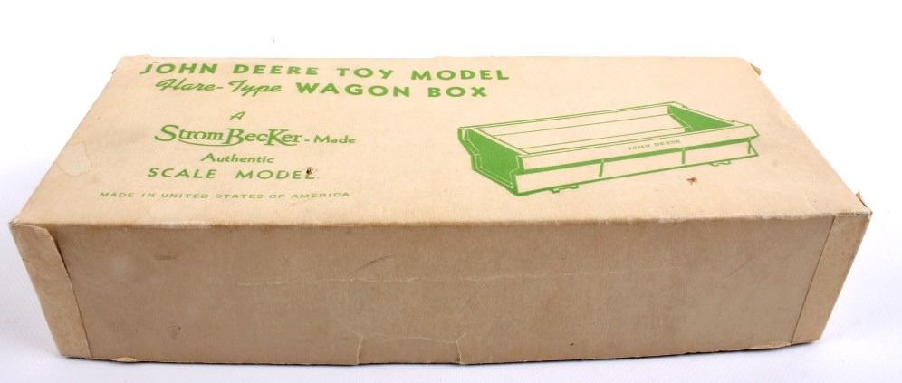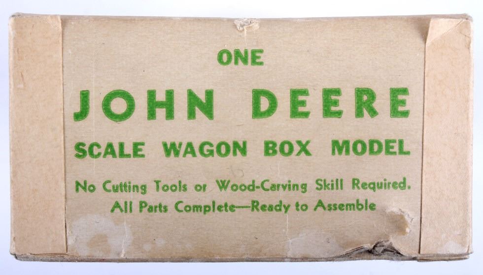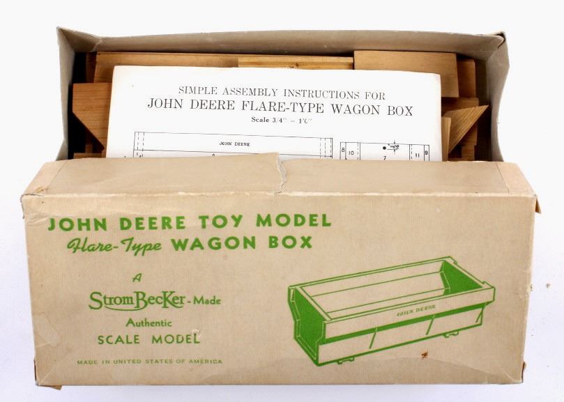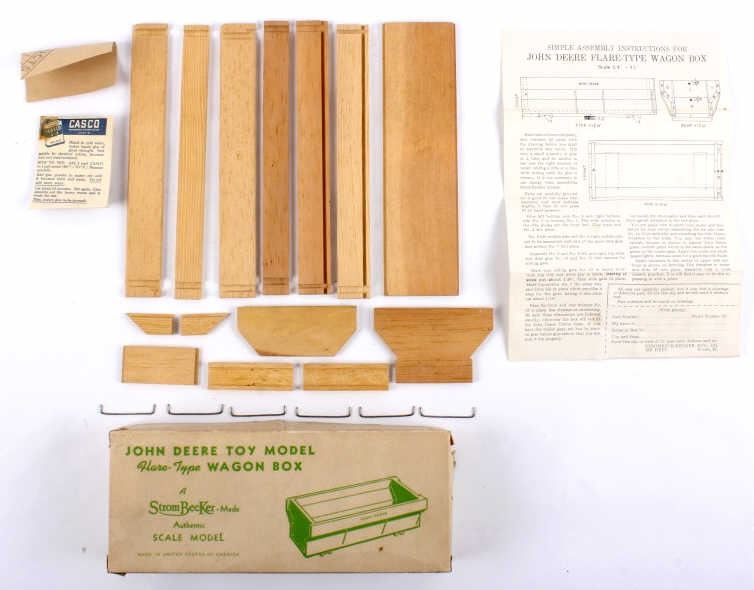 You have the unique opportunity to bid on this ultra rare Strombecker made John Deere Toy Model Hare-Type Wagon Box, ca. 1940. Strombecker brand sold pre-carved wood model kits from he 1930's through the 1950's. The company was especially known for their airplane and steam locomotive models. This lot includes the unassembled toy parts (believed to be complete) and Casco powdered glue packet , the original assembly instructions, all inside the original box. This is such a rare item, that a person was selling a limited number of REPRODUCTION boxes that came only with a photocopy of the original instructions for $100. The box measures 9" x 3.75" x 2". The box shows normal age-related wear, including a rip on one side. It is in very good condition overall.