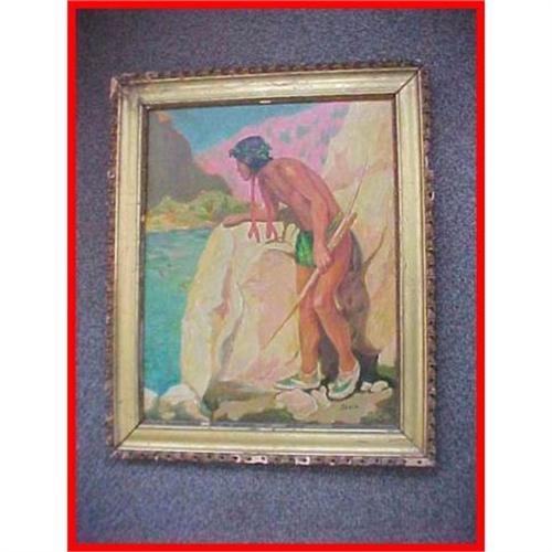 </font></strong>This 21-1/2" by 17" original oil painting on panel is of an American Indian standing in a rocky area near a body of water. The Impressionism painting come in a 26-1/4" by 21-1/2" gold wood/plaster frame. Signed "Skala"(SEE PHOTO) in the lower right corner. I would guess the age in the 1940's or earlier. Painting has not been taken out of frame. Painting is in good condition; frame needs some restoring with some chipping. Antique label on back of frame(SEE PHOTO).</font>