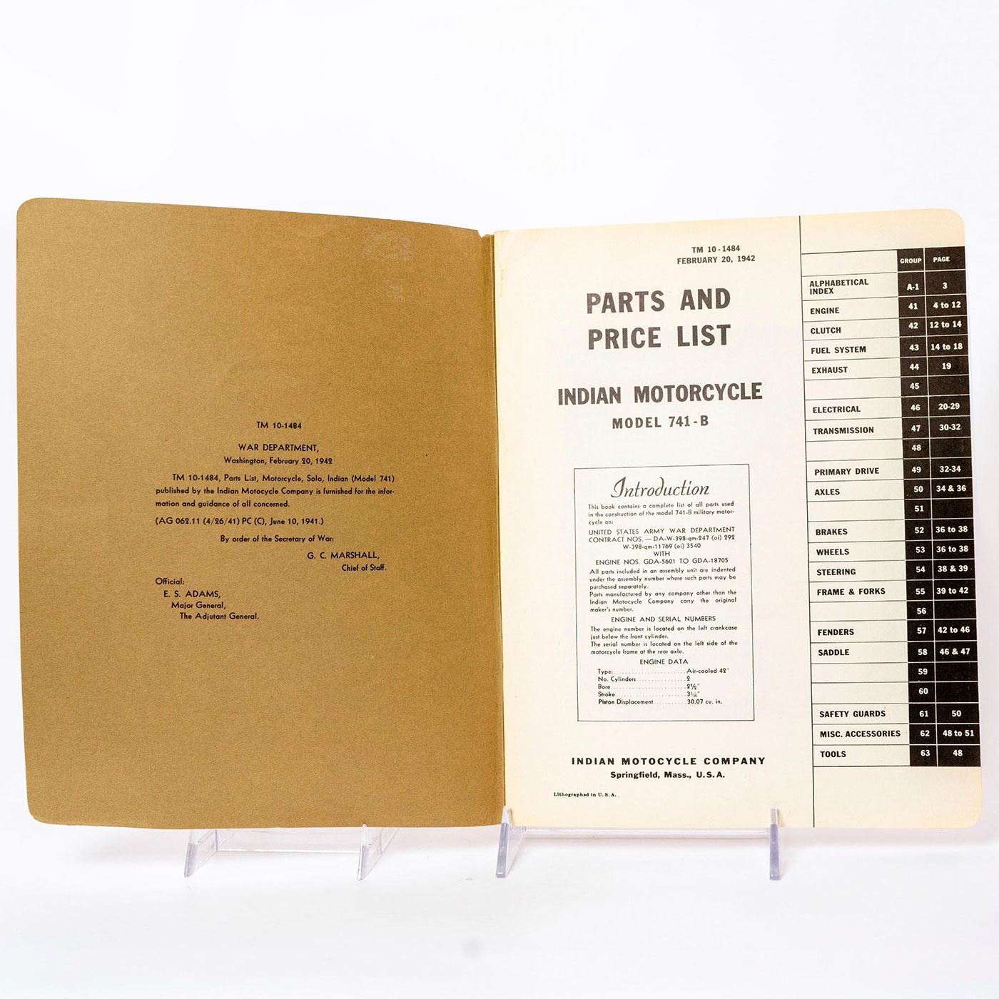 Parts and price list for model 741-B. T.M. - 10 - 1484 February 20, 1942. Excellent vintage condition. Previous owner's name signed on the front cover. Light discoloration and tiny tear on the front and back covers. Some creases on corner of the book. Automobilia