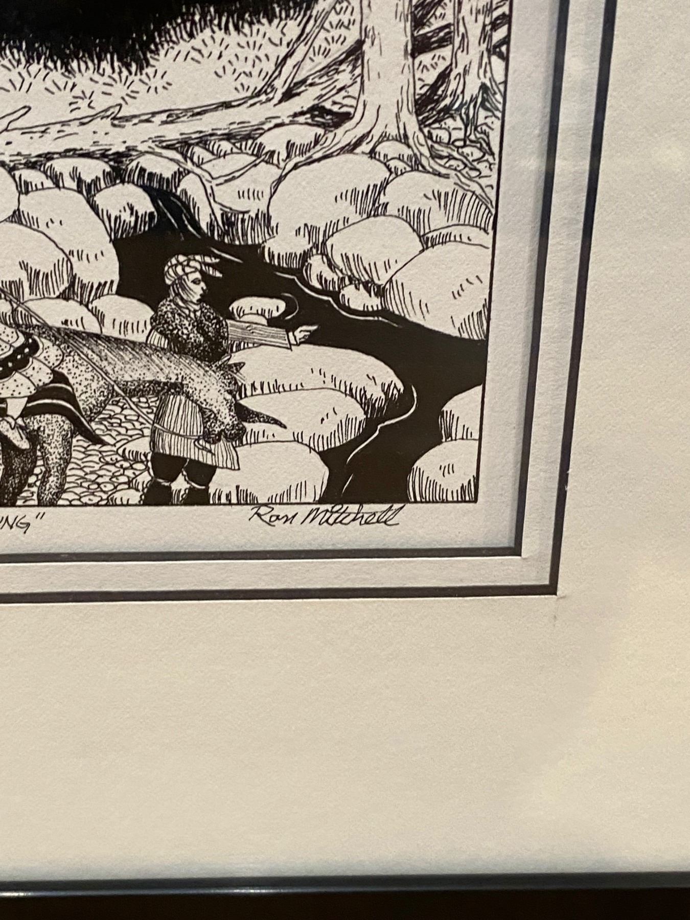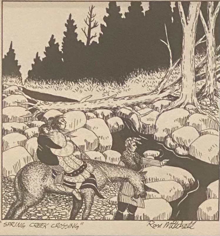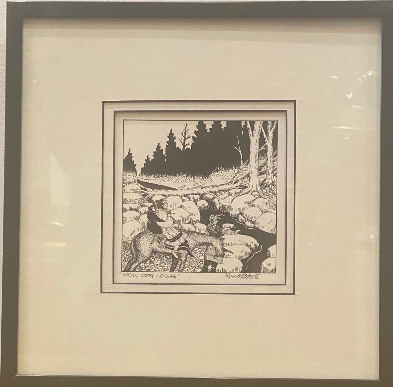 Titled Spring Creek Crossing it talks to Ron Mitchell's Cherokee Heritage. This Ink Drawing Measures 4 by 4 inches and framed up measures 10.25 by 10.25 inches.