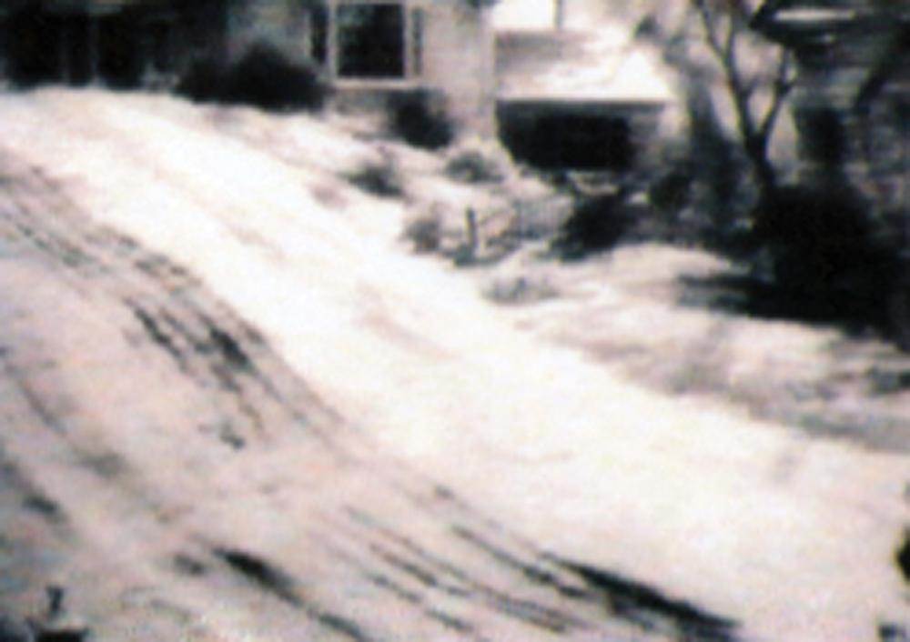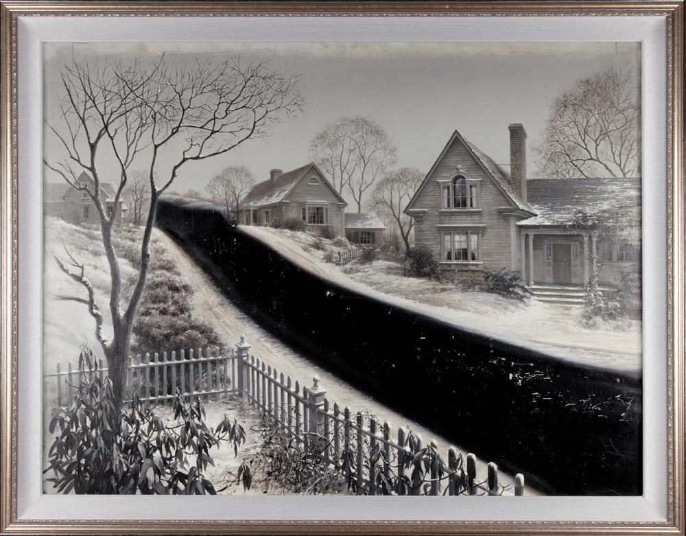 (Selznick, 1945) Original matte painting rendered in white paint on black illustration board from the film, Spellbound. This is the icy view outside the window of psychologist Constance Petersen (Ingrid Bergman), and in the key scene of the film when John Ballantine (actor Gregory Peck) falls into a deep demonic trance as he begins to understand the significance of why the color white and parallel lines drive him to insanity and amnesia. Ski tracks left in fresh snow prove to be the defining clue in determining he is not the murderer he is accused of being. The painting has a blacked-out road that runs through the middle of the image, where live action of children skiing were later framed in using photo compositing by visual effects pioneer, Mr. Jack Cosgrove. Inspired matte artists of the golden age of Hollywood were crucial to telling the story, as they could transport us to vast vistas, exotic locales, or magical worlds with little more than a paintbrush and a small canvas. This painting measures 38 in. tall x 48 in. long and housed in an archival frame with silk mat.