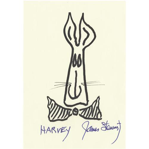 <B>Original James Stewart "Harvey" Drawing, Signed by Stewart.</B></I> Elwood P. Dowd in <I>Harvey</B></I> is one of James Stewart's most beloved performances and he enjoyed drawing sketches of his tall invisible rabbit pal. This sketch by Stewart on 7.5" x 10.5" paper captures the hare (complete with bow tie) in black felt tip, and Stewart added the "Harvey" notation and his name in blue. A classic film, a great star, and a charming item, in Excellent condition. <I>Accompanied by LOA from PSA/DNA/</B></I><BR><BR><b>Shipping:</b> Flat Material, Small (<a target="_blank" href="http://www.heritageauctions.com/common/shipping.php">view shipping information</a>)