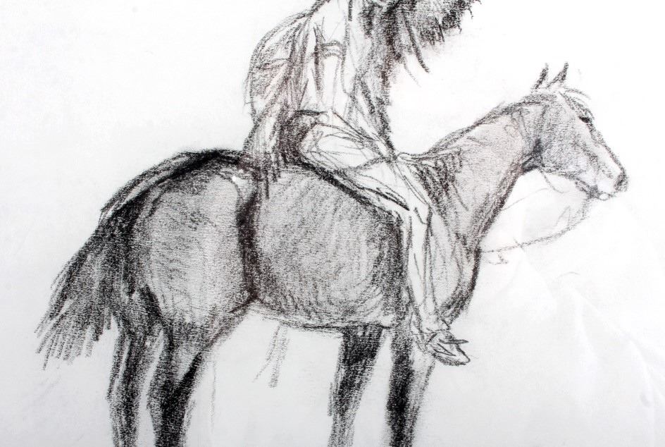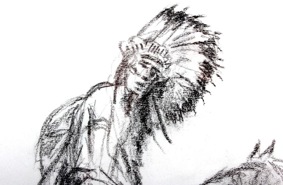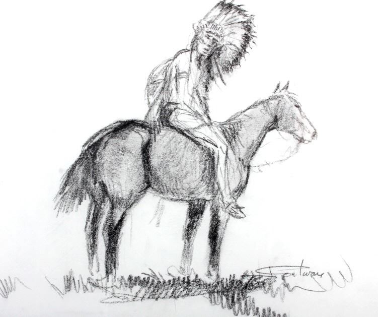 This is an original Jay Contway framed charcoal sketch. Contway is a native Montanan who has spent the majority of his life as a cowboy, rancher and Western artist. He has had a successful and prestigious career as an artist having been inducted into the Calgary Stampede Western Art Show Hall of Fame in 2008, the C.M. Russell Museum Skull Society of Artists in 2014 and 2015, the Montana Pro Rodeo Cowboy Hall and Wall of Fame in 2016 as well as the Montana Cowboy Hall of Fame & Western Heritage Center in 2016. This is a wonderful sketch of a Native American Indian on horseback. The piece shows good condition. It has been signed by the artist and is professionally framed. The frame measures 19.25" x 23.25".