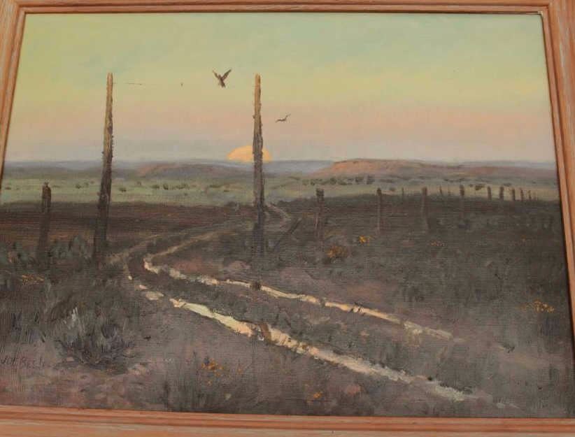 Original Joe Beeler oil on canvas entitled, “The Homestead Road”. The ranch Joe lived and worked on in Arizona circa about 1960. Purchased by “Andy” Anderson from fellow artist Joe Beeler. Left by Anderson to aDoctor who treated him in his last years. Est.: $2500-$5000