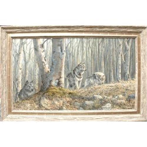 Jorge Mayol original acrylic painting on canvas. Signed lower right 2000. Three wolves in the woods looking toward the sunrise. Canvas 26" x 44". Frame: 35" x 53"