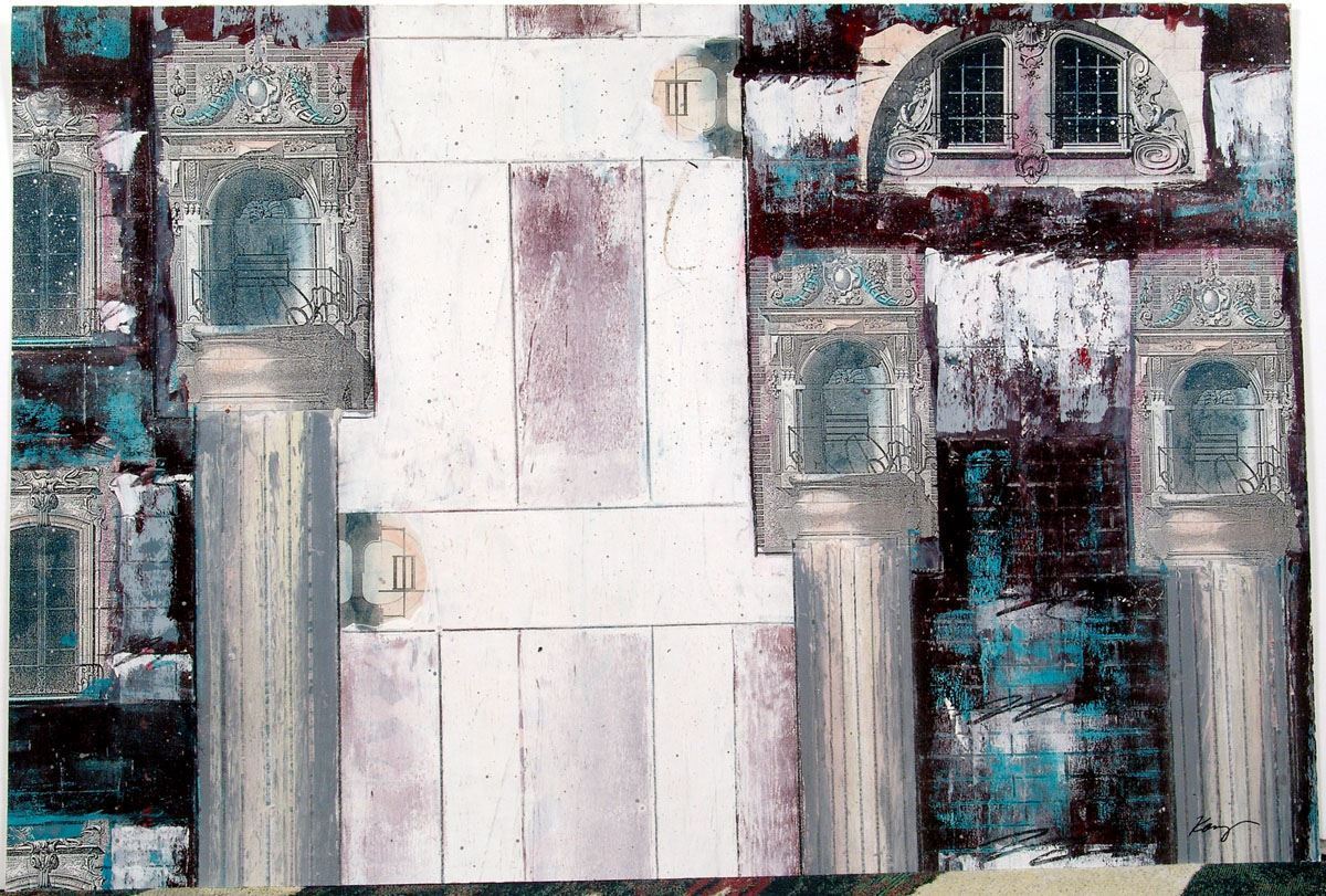 This is an original abstract painting by Kamy Deljou. Hand-signed. This interesting mixed-media piece is a combination of paint and prints/decals. SIZE: 36" x 24". Kamy has many well-known prints out and his art is produced at Deljou Art Group--the world's leading publisher of fine art, renowned throughout the industry and internationally and their printing technology is second to none. Kamy Deljou was born in Shiraz in October, 1957. He began his training at the Metier Guild and apprenticed at the Dariush Academy of Shiraz. He earned his mastership at Pahlavy University, famed for its modern art disciplines and its demanding standards of craft in a wide range of media: acrylics, pastels, oil, inlay, print making, and serigraphs. He arrived in the United States in 1979 and established his atelier at "Graphique Du Jour Studios," working with some of the most brilliant names in contemporary art. With artists like Lee White, Denis Assayac, and Ken Weaver, he developed innovative and original techniques combining ink, acrylic, and oil creating bold, elegant shapes and colors, rich in texture and patterns. In the process, Kamy has patented several printing techniques. Over the past decade he has exhibited his art throughout the U. S. and around the world. Kamy Deljou: "I paint with openness, freedom, expressiveness - of inner feelings, thoughts, sensibilities - colors, form, design - with quiet impact, strong sensitivity - so that your inner feelings, thoughts, sensibilities will reflect the same heightened sensations."