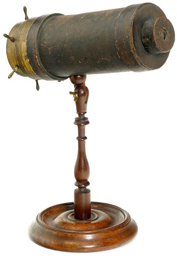 Original-Kaleidoskop "Bush", um 1840 Eine absolute Rarität! Tischgerät mit papierbezogenem Tubus und kleinen farbigen, mit Flüssigkeit gefüllten Glaskörpern. Auf Holzfuß. Höhe: 33 cm. - Ein Super-Sammlungsstück!