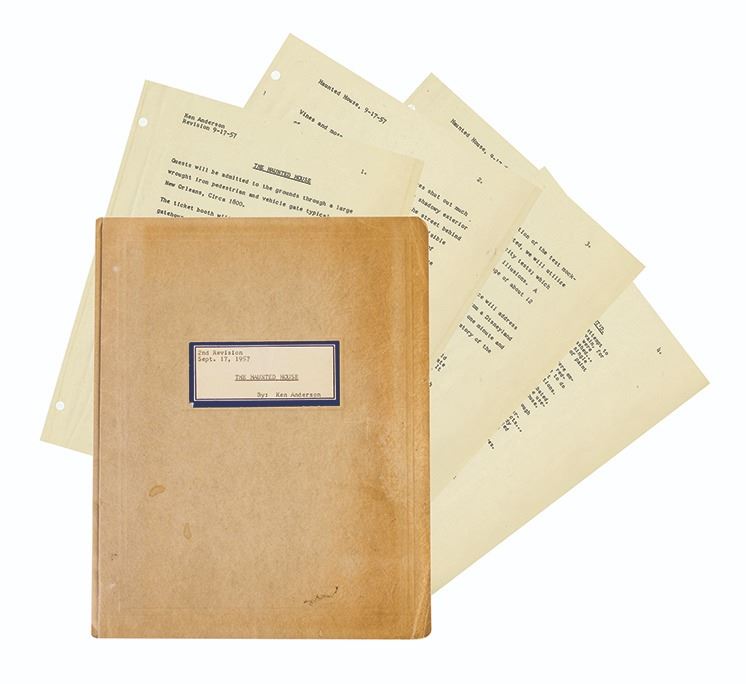 (Disneyland, 1957) An extremely rare original script for the "Haunted Mansion" written by Imagineer Ken Anderson. This script was created in September of 1957, nearly twelve years before the attraction would open. While the "Haunted Mansion" would change and evolve over the years into its current incarnation, this script offers a remarkable opportunity to see how the attraction would have looked during some of its earliest stages of development. This script includes the entire story of the attraction, as proposed by Anderson in 1957. This includes the dialogue from the never-realized "Lonesome Ghost", as well as cast member dialogue, and an opening narration by Walt Disney. The script further describes various gags and spooky elements which would have been seen in the Mansion, and describes the history of the "Blood Family" who own "Bloodmere", an original proposed name for the Mansion. This 27-page document comes in a protective folder which reads "The Haunted House by Ken Anderson - 2nd Revision Sept. 17, 1957" on the front label. The script measures 11.5"x9" and is in very good condition with some yellowing to the cover from age.