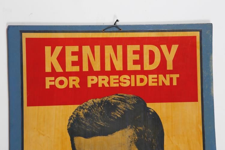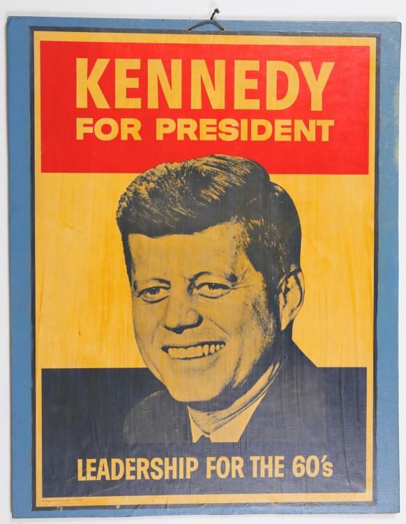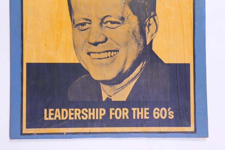 Offered for sale we have an Original Kennedy for President Leadership for the 60's that is mounted on board. We believe that this political poster hung in a Kennedy campaign office. The poster has been mounted on a painted blue board and the poster itself has been painted yellow. The Board Size is 21.75" x 27.75" and the Poster Size is 19.25" x 26.75".