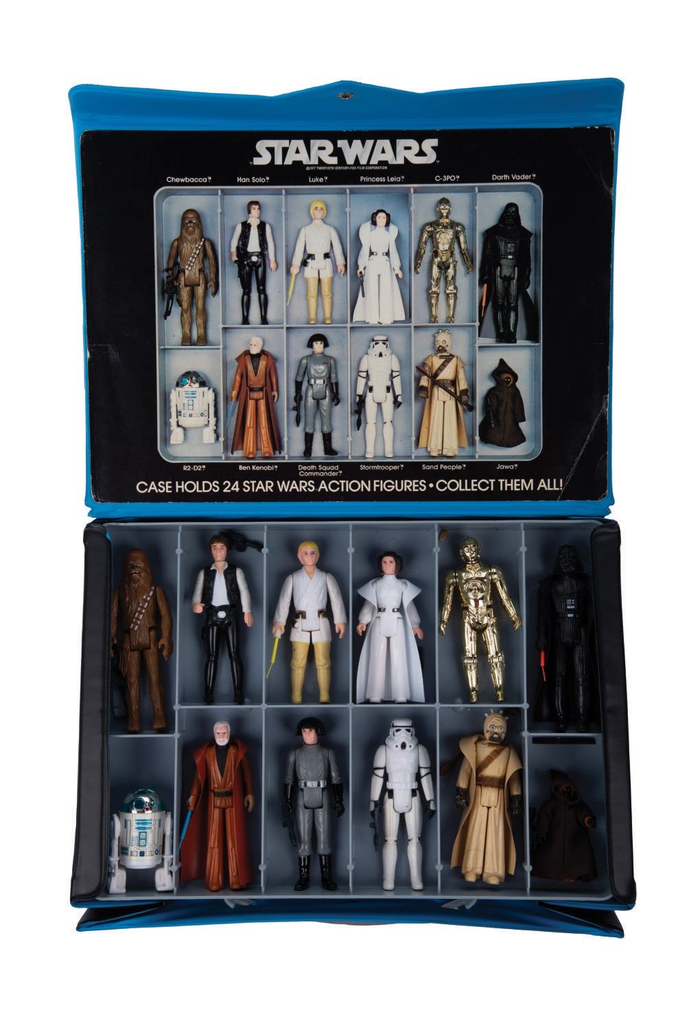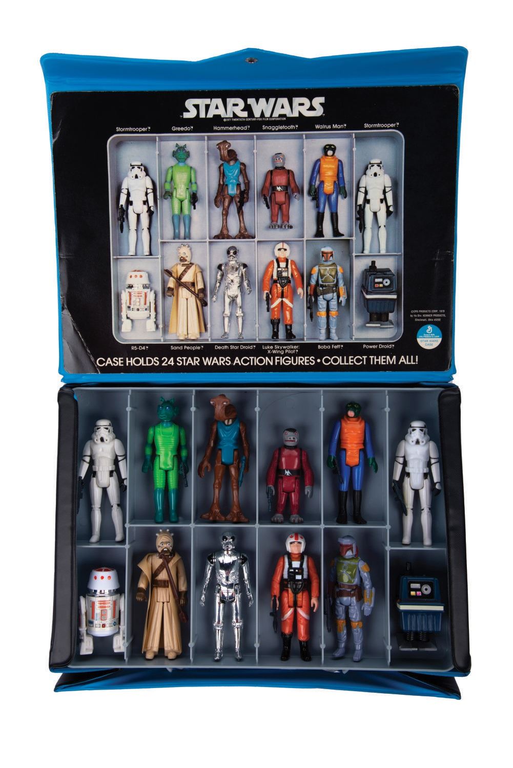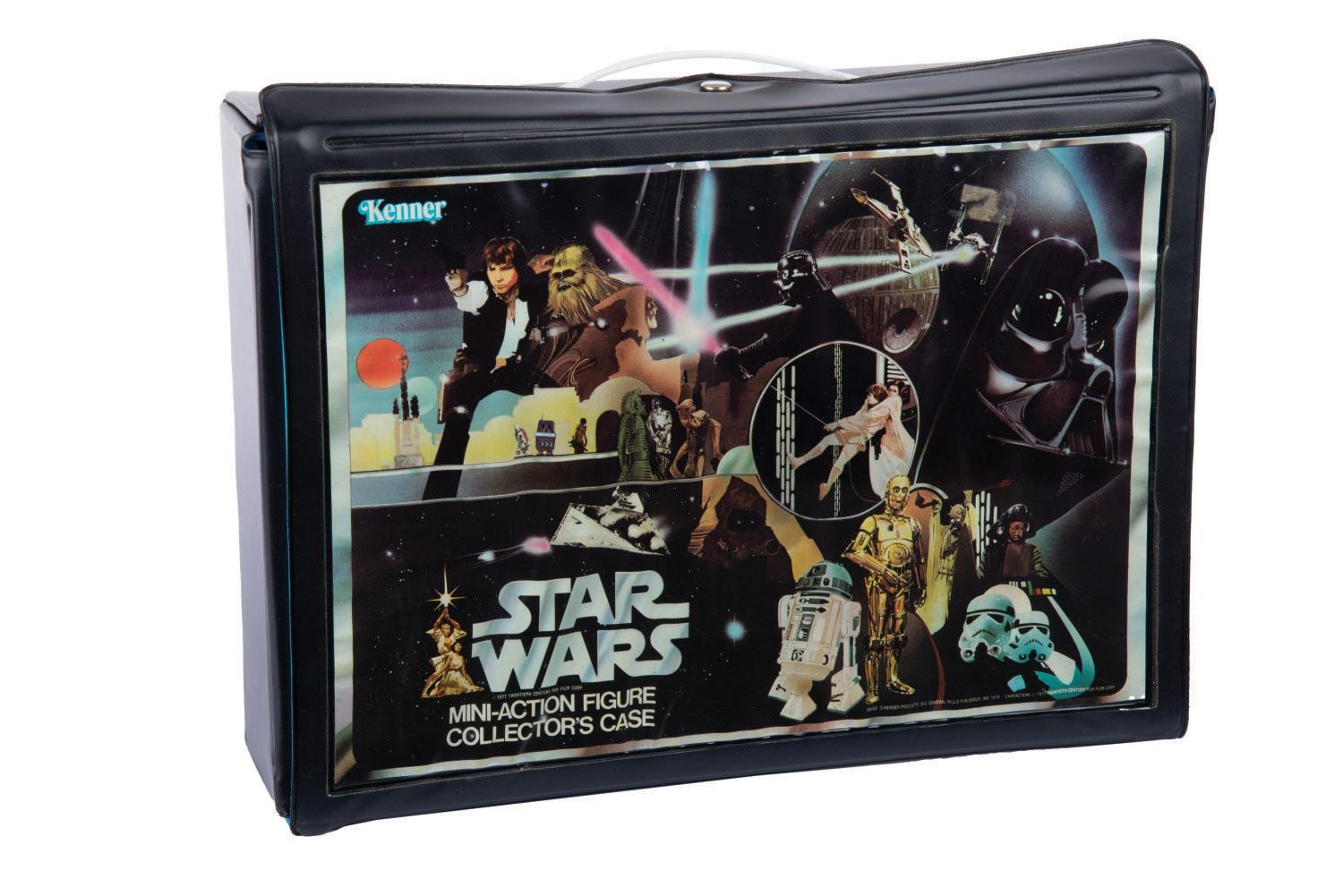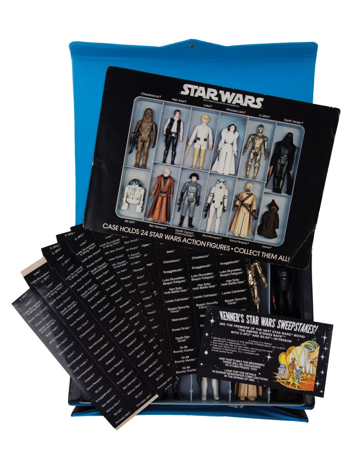 (Kenner, 1977-79) A collection of (24) original Star Wars Action Figures inside a Mini-Action Figure Collector's Case. These are known as the "first 21" figures - all from the first film "Star Wars" in 1977, with the addition of Boba Fett, who debuted in the notorious Star Wars Holiday Special in 1978. Meticulously collected in the original collector case,they include (2) extra Stormtroopers and (1) extra Sand People figure to exactly match the product photos on the case's cardboard insert. All the figures are of Hong Kong manufacture, with a white hair Ben Kenobi and a "Big Head" Han Solo. All original accessories are included with the exception of Princess Leia's tiny original blaster; a later Bespin Guard gun is included in its place. The case also comes with (5) sheets of adhesive labels, original insert card, and the rare Star Wars Sweepstakes flyer which offered an opportunity see the premiere of the "The Empire Strikes Back." Each 3.75 inch scale figure is in very fine to fine condition with stiff joints, pristine paint, intact singular telescoping lightsabers, vinyl capes, and cloth robes. The case measures 12.75"x9"x3.5" and is in very good condition exhibiting slight buckling to the vinyl graphic on the cover typical of this piece.