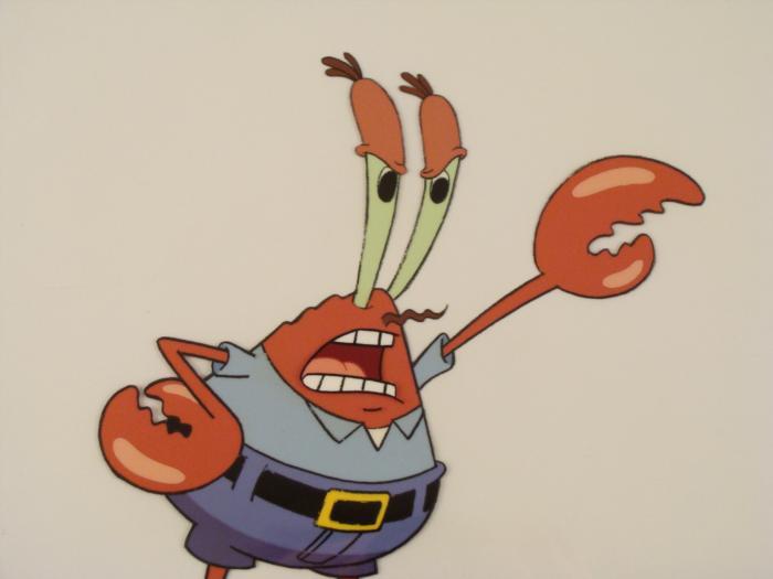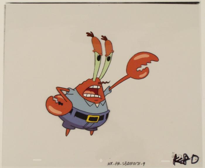This original animation cel is from the Nickelodeon TV show SpongeBob Squarepants. The story takes place under the deep blue sea in Bikini Bottom, where SpongeBob resides. SpongeBob, who is a yellow, porous sponge, is your typical happy-go-lucky character, as he is always cheerful and enjoys making people laugh. Patrick Star, SpongeBob's neighbor who is a starfish, is your average children's show idiot, as he boasts knowing nothing and is often getting himself into ridiculous situations. Between the homes of these two lies the home of the miserable Squidward, a squid, who is known for being grouchy and playing tricks on SpongeBob and Patrick. Both SpongeBob and Squidward work at the Krusty Krab, a fast food business run by the greedy money-loving Mr. Krabs, a crab, the arch rival of the evil, possibly misunderstood, Plankton. Another neighbor, Sandy Cheeks, an athletic squirrel who normally wears an astronaut's space suit, was introduced in "Tea at the Treedome." She spends most of her time inventing and experimenting. Mr. Krabs is angry.Original Production Animated Cel Overall Size of Cel: 10 1/2" x 12 1/2" Very Good ConditionThis is an original hand-painted cel set-up used in the production of an episode of "SpongeBob SquarePants." Each one-of-a-kind set-up represents a slight change in position of the characters. When individually photographed and projected in rapid succession, the images appear to move.