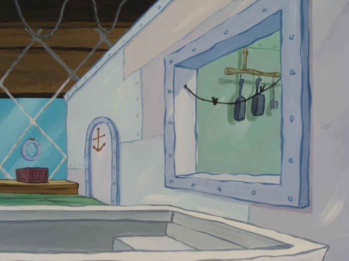 This original hand-painted background from the Nickelodeon TV show SpongeBob Squarepants. The story takes place under the deep blue sea in Bikini Bottom, where SpongeBob resides. SpongeBob, who is a yellow, porous sponge, is your typical happy-go-lucky character, as he is always cheerful and enjoys making people laugh. Patrick Star, SpongeBob's neighbor who is a starfish, is your average children's show idiot, as he boasts knowing nothing and is often getting himself into ridiculous situations. Between the homes of these two lies the home of the miserable Squidward, a squid, who is known for being grouchy and playing tricks on SpongeBob and Patrick. Both SpongeBob and Squidward work at the Krusty Krab, a fast food business run by the greedy money-loving Mr. Krabs, a crab, the arch rival of the evil, possibly misunderstood, Plankton. Another neighbor, Sandy Cheeks, an athletic squirrel who normally wears an astronaut's space suit, was introduced in "Tea at the Treedome." She spends most of her time inventing and experimenting. Why is Squidward not working?Original Production Background Overall Size of Background: 10 1/2" x 13 3/4" Very good condition; it has been storedOriginal Production Backgrounds are used in the making of the final version of animated productions. The background establishes the location and the overall good mood of the scenee. Typically, a background layout artist creates a drawing to establish the content of the scene, placement of characters, perspective and camera angle. Based on this drawing, the background artist creates a preliminary painting to confirm all of the scenes details, then the final production background which is used in the filming of the scene. When these backgrounds are individually photographed behind the progression of production cels, and projected at a rapid succession, the images in the foreground appear to move, creating an animated scene. The background is ready to be matted and framed. It is a colored background with the animator's notations at the bottom.