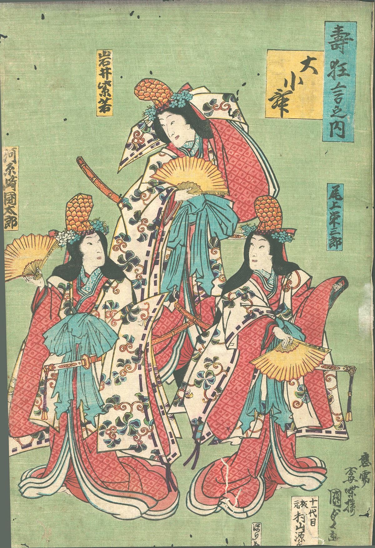 Original Kunisada II (1823 - 1880) Japanese Woodblock Print, Oban, approximately 9 1/2" x 14 1/2", This print with nice detail as shown. Some staining. Repaired. See photo for details