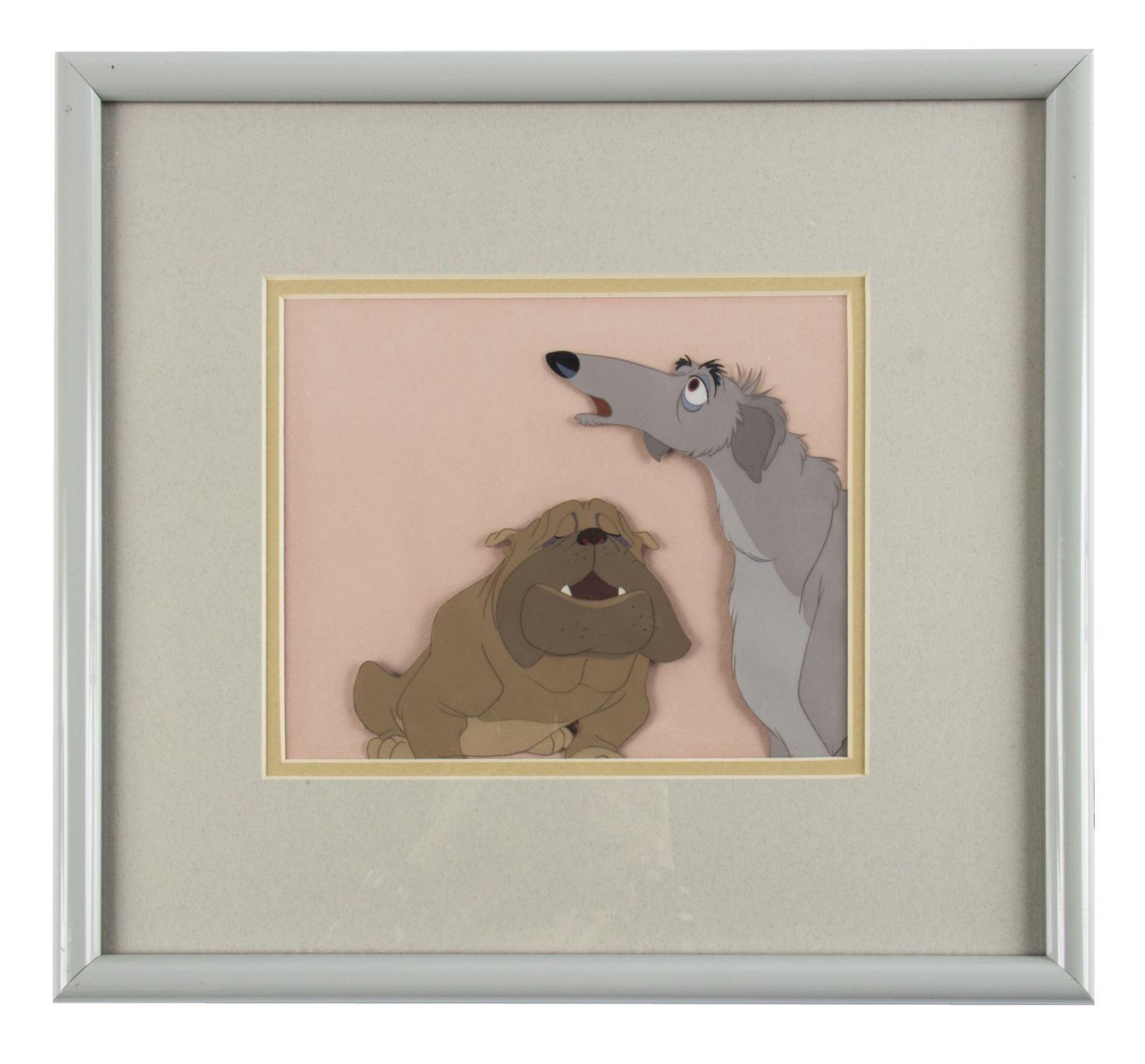 (Walt Disney Studios, 1955) An original production cel of the pound dogs Bull and Boris from the feature film Lady and the Tramp. This hand-painted cel was originally sold at the Disneyland Art Corner, and still has the original gold Art Corner label on the reverse. The cel has an image size of 6"x7.5" within its 12.5"x13.75" frame. The cel has not been examined out of frame, but appears to be in very good condition with minor wear to the frame from previous display.
