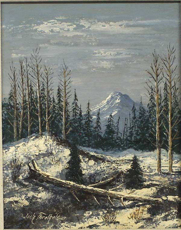 Original Framed Landscape Oil Painting by Jack Threlkeld, visual measures 8'' x 10'' and is signed, overall framed measurement 18.5'' x 16.5'', on board, Santa Fe Artist