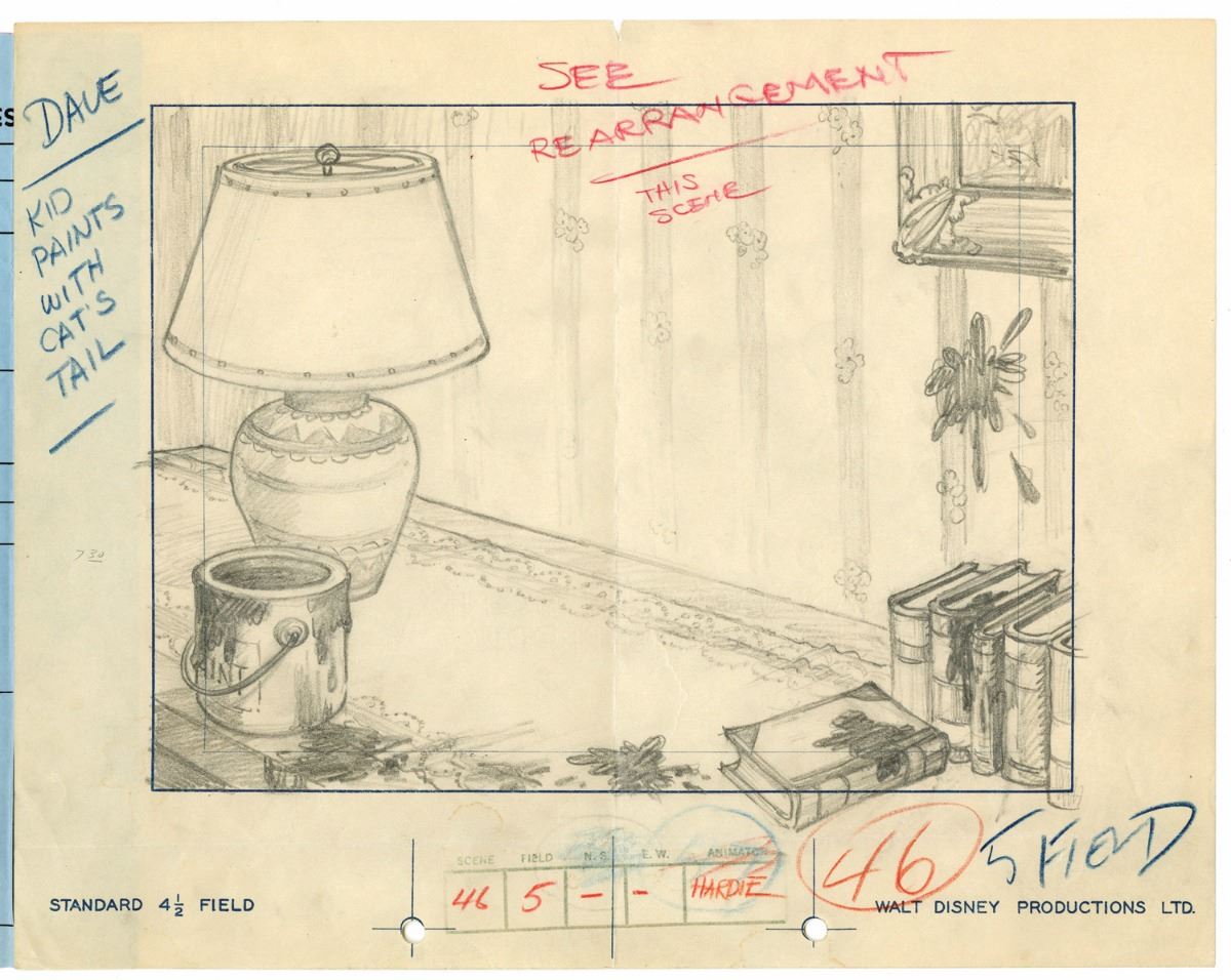 (Walt Disney Studios, 1932) Original background layout drawing from "Mickey's Nightmare". Accomplished in graphite on untrimmed 9.5"x12" animation paper with an image side of 7"x9.25". Contains several hand-written scene notes around the border. In very good condition with minor wear and a faint vertical fold mark down the center.