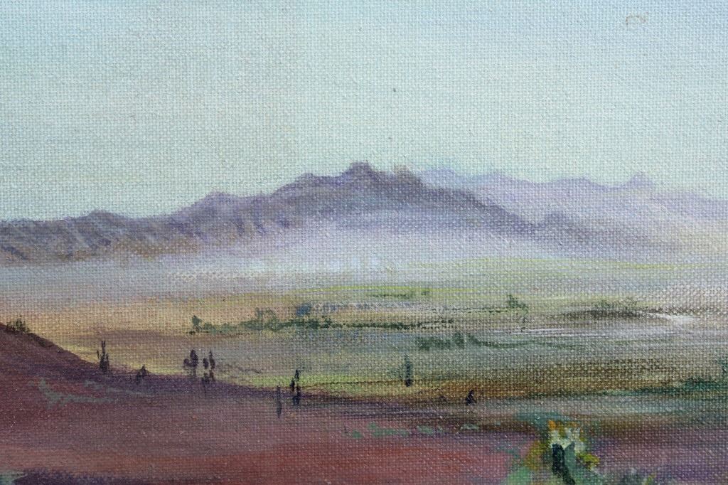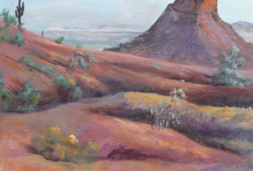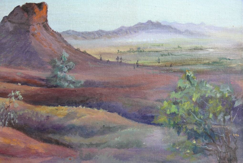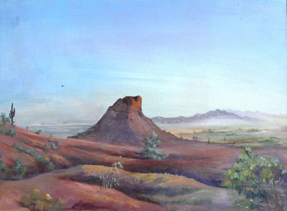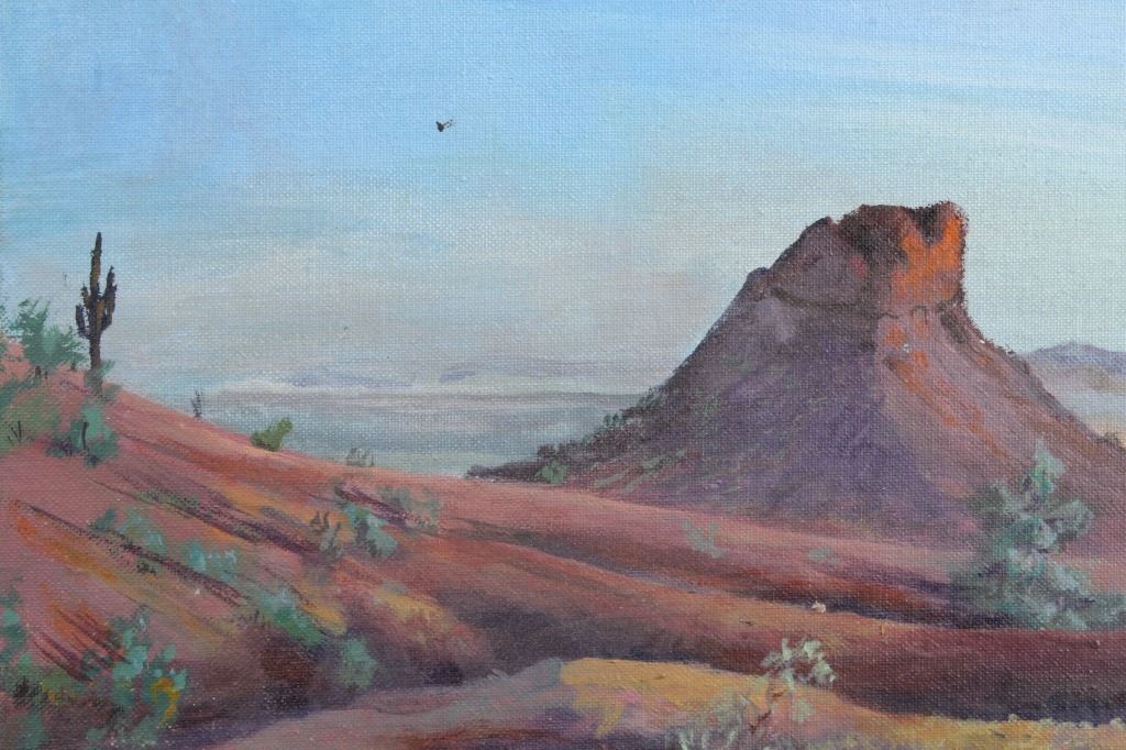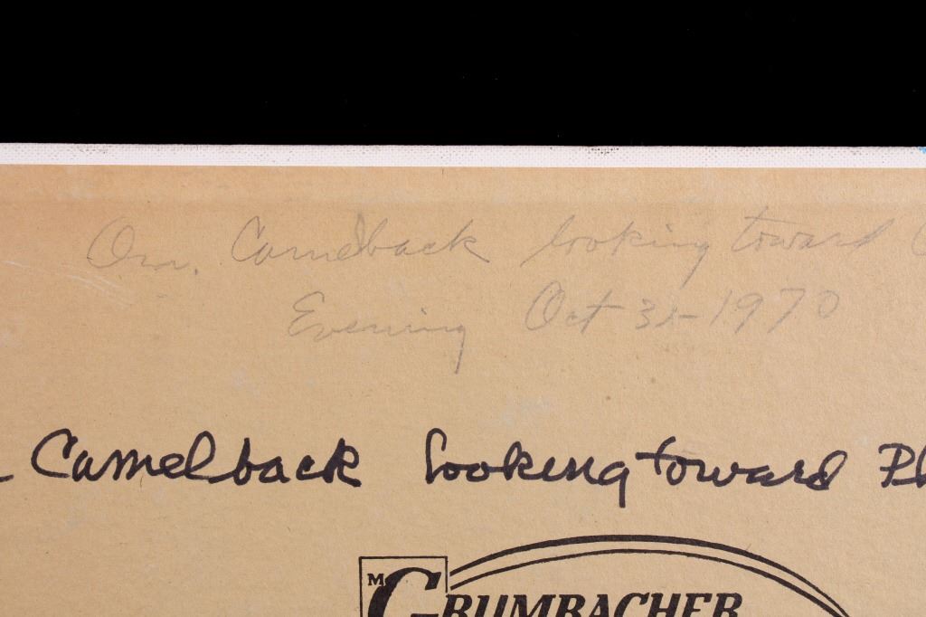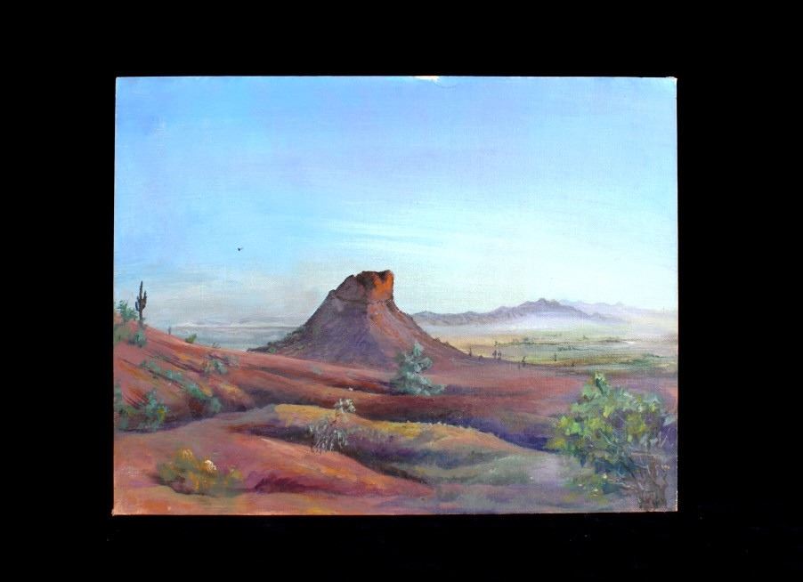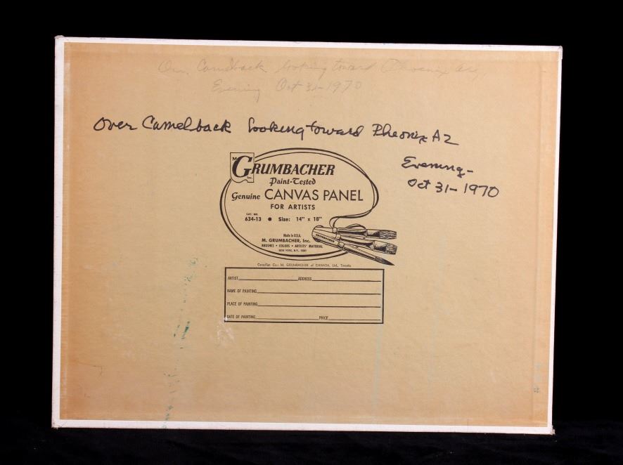 Included in this lot is an original Lily Tolpo oil painting of the Camel Back Overlook from 1970. Lily Tolpo (1917-2015) was the wife of artist Carl Tolpo. She was known as an American painter, sculptor, and designer who worked from Illinois studios for over six decades. This 1970s Arizona landscape painting by Lily Tolpo portrays a view from the Camel Back Mountains overlooking Phoenix. On the back of this painting is marked "Over Camelback looking toward Phoenix, AZ, Evening- Oct 31-1970.” This piece is in good condition and measures 18" by 14".