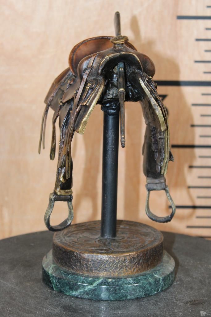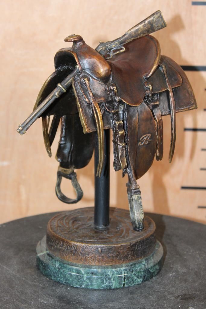 Original Limited Edition #185/2500 BRONZE Saddle Sculpture signed by artist Robert J. Beeler. It measures 9.5" Tall x 6.25" Long x 5" Wide and Weighs 9 lbs 8 oz. It has a removable Winchester Rifle. COLLECTIBLE BRONZE SCULPTURES