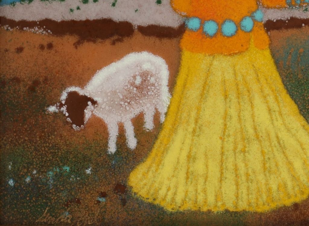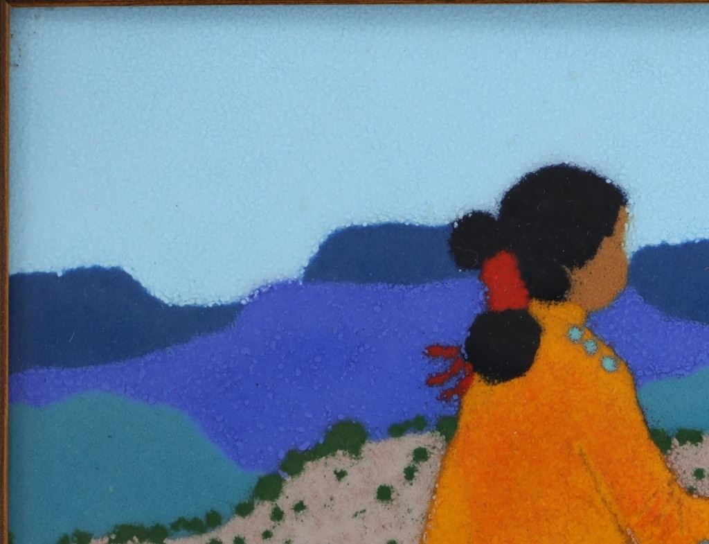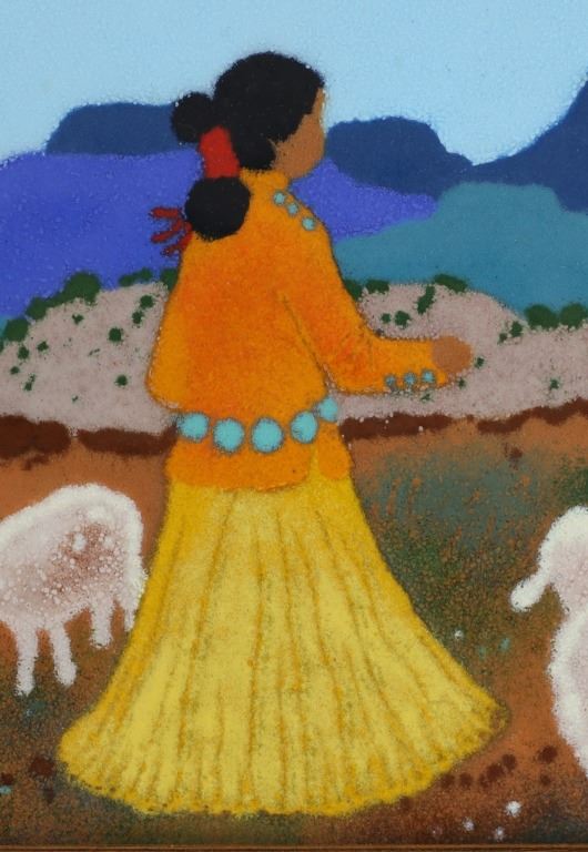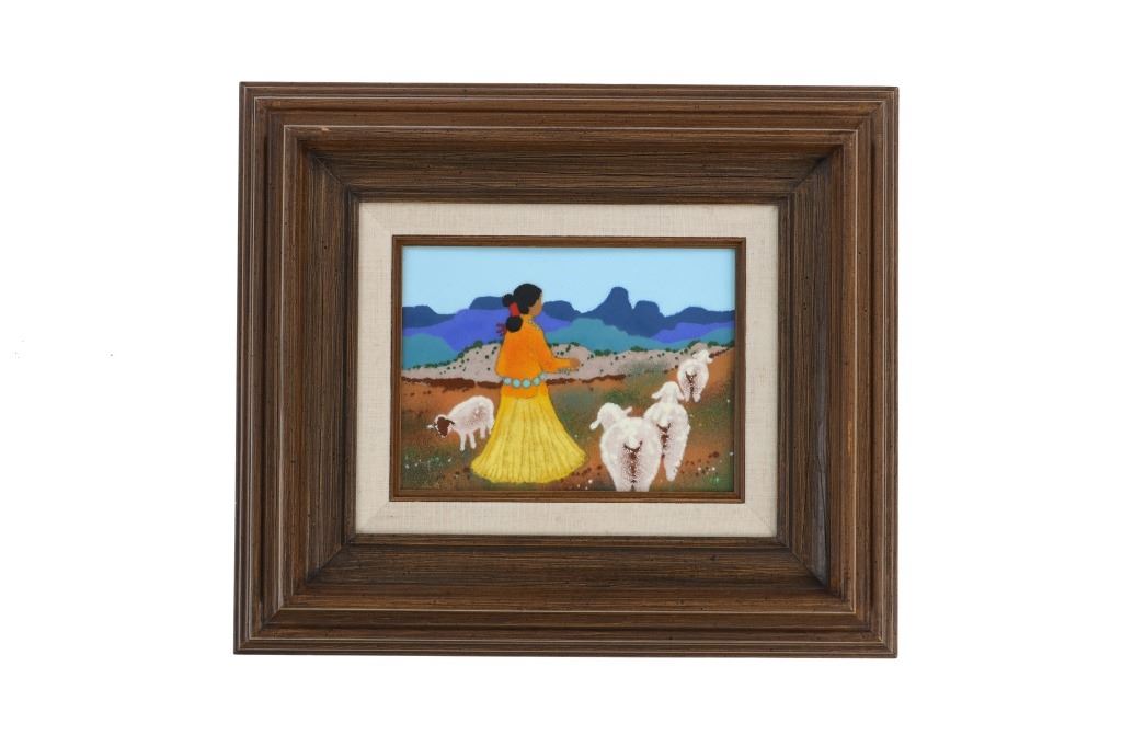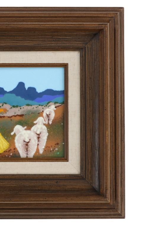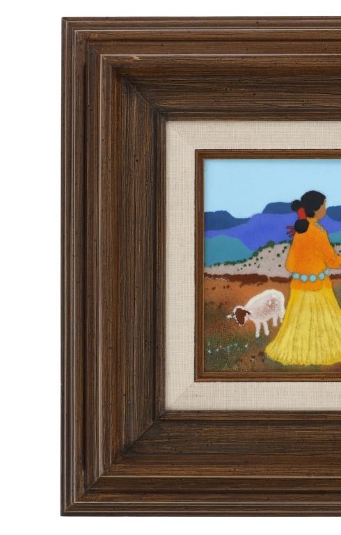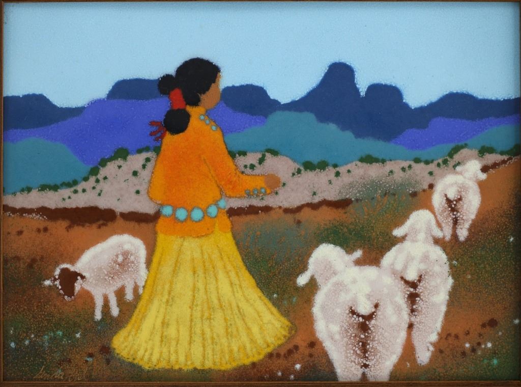 Featured in this lot is this original Linda Pond enamel on copper circa 1990s. Linda Pond is an American artist known for her colorful enamel paintings on glass, copper and more. This original painting is set in a shadowbox style frame constructed of wood and canvas. The painting shows a woman in a yellow, orange and light blue dress standing in a grass and flower field around four sheep. The background shows a beautiful mountain scene with colors of blue, teal, purple and light blue. The artwork shows good condition overall with no signs of wear or damage present. The visible art measures 5 9/16" L x 7 9/16" W, while the entire piece measures 13" L x 15" W x 1 1/2" D.