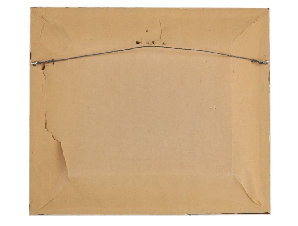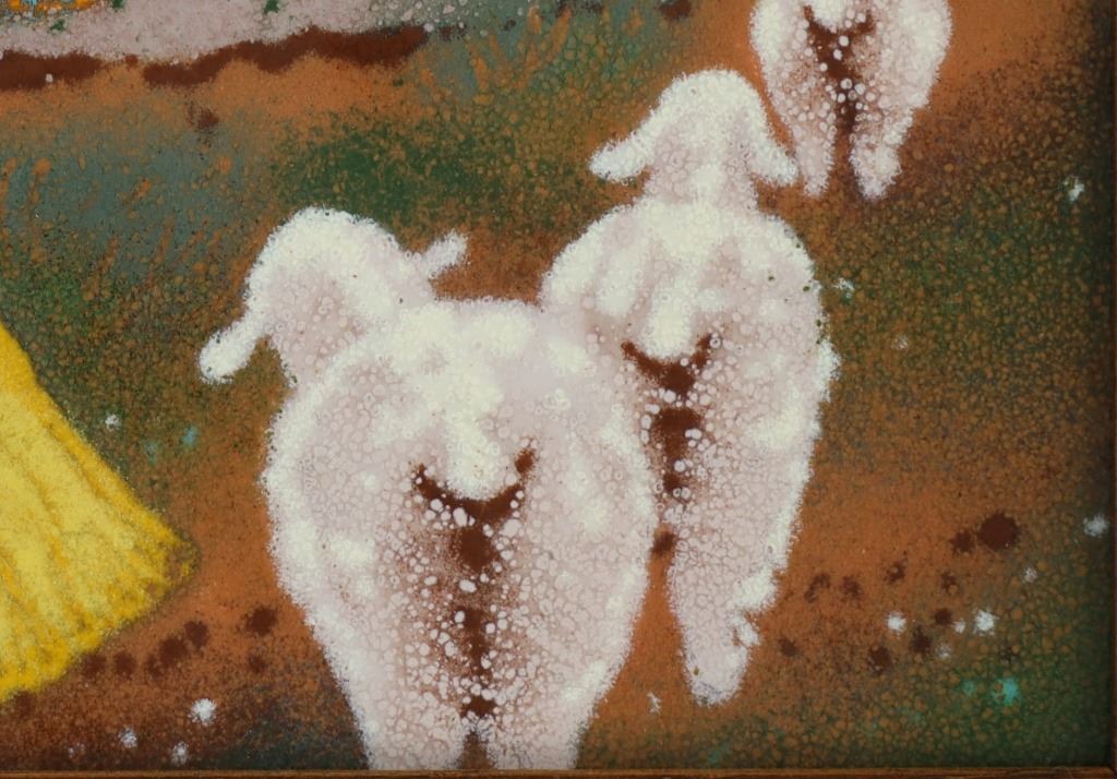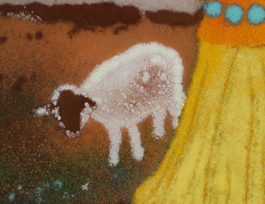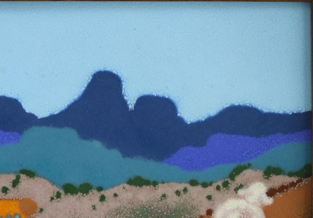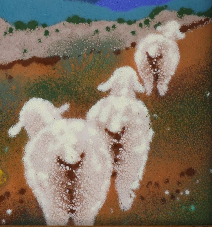 Featured in this lot is this original Linda Pond enamel on copper circa 1990s. Linda Pond is an American artist known for her colorful enamel paintings on glass, copper and more. This original painting is set in a shadowbox style frame constructed of wood and canvas. The painting shows a woman in a yellow, orange and light blue dress standing in a grass and flower field around four sheep. The background shows a beautiful mountain scene with colors of blue, teal, purple and light blue. The artwork shows good condition overall with no signs of wear or damage present. The visible art measures 5 9/16" L x 7 9/16" W, while the entire piece measures 13" L x 15" W x 1 1/2" D.
