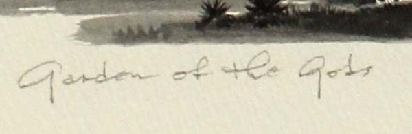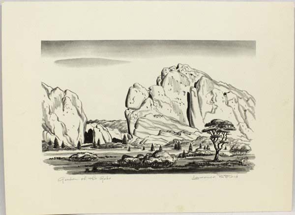 Original Lithograph ''Garden of the Gods'' by Lawrence B. Field, visual measures 12'' x 7.5'', hand signed, can be rolled to ship, FYI: ''Laurence B. Field (1909-1999) was born in Cleveland, OH. He was an accomplished painter and graphic artist. Field was best known for his Colorado landscapes.''