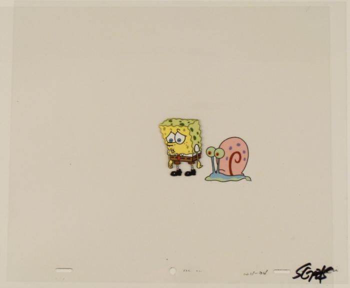 To create production cels, the original animator's drawing is transferred onto an acetate cel (by hand-inking and/or photo copying). The cel is then hand-painted on the reverse side. The cel is ready to be matted and framed. The animator's notations are at the bottom of the cel. There is some slight paint fade to SpongeBob's outline. The cel has multiple layers; first is SpongeBob and the second cel is Gary.