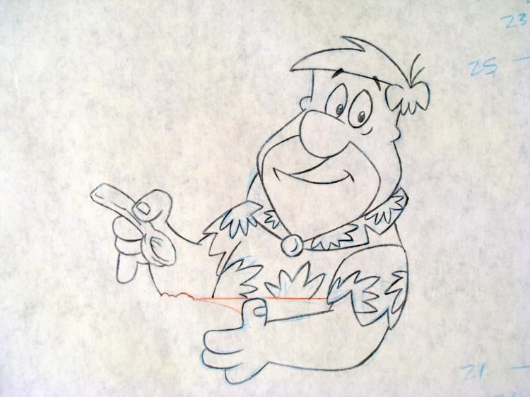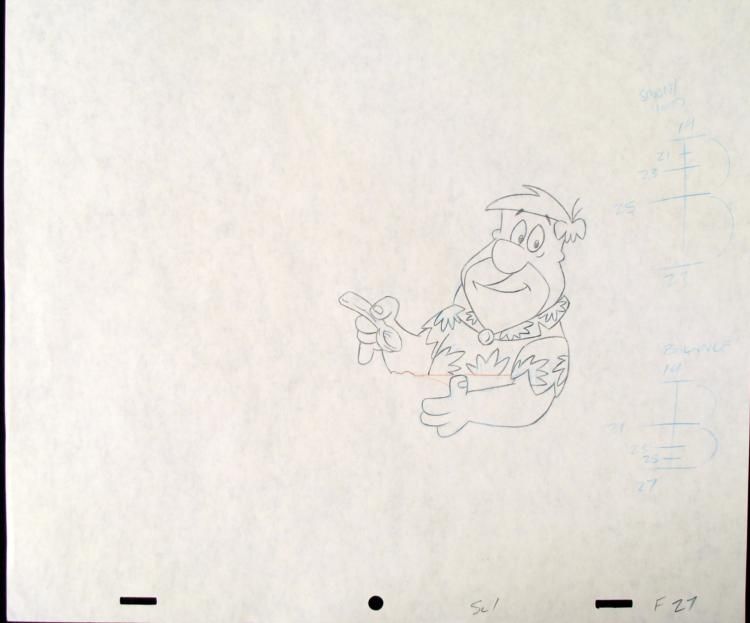The show is set in the Stone Age town of Bedrock. (In some of the earlier episodes, it was also referred to as "Rockville"). The Flintstones was about a working-class Stone Age man's life with his family and his next-door neighbor and best friend. The show's * continuing popularity rested heavily on its juxtaposition of modern everyday concerns in the Stone Age setting. In this fantasy version of the past, dinosaurs, saber-toothed tigers, woolly mammoths, and other long-extinct animals co-exist with cavemen. Like * their mid-20th century peers, these cavemen listen to records, live in split-level homes, and eat out at restaurants, yet their technology is made entirely from pre-industrial materials and largely powered through the use of various animals. For example, the * cars are made out of stone, wood, and animal skins, and powered by the passengers' feet. * * * Lunch break... Do not disturb... * * * * * Original "rough" animation drawing, in non-photo blue and black pencil with the notations in black and non-photo blue * * Overall size is a 12-field drawing that is 10 1/2" × 12 1/2" * Excellent condition * Traditional animation is a multi-step process which includes various types of art techniques. Drawings are a key part of the process, in which the animator creates the design and movement of the characters. Drawings are then transferred onto acetate cels * (by hand-inking and/or photo copying) to create a production cel, which is then hand painted on the back side, using paint colors chosen and approved by the creator of the series. * * * The drawing is ready to be matted and framed. The animator's notations are shown at the top and bottom of the drawing. * *