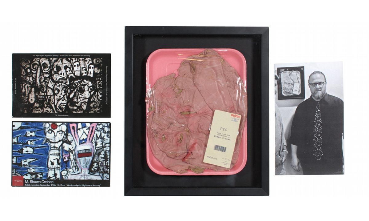 Original M. Shawn Crahan art, 1 of 1 hand signed on reverse of frame, this pig mask was part of the 2009 gallery show "An Apocalyptic Nightmare Journey" featured at Moberg Gallery in Des Moines, IA, Crahan is best known as "Clown" from Grammy award winning heavy metal band Slipknot, 13.75"H x 11.75"W.