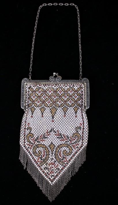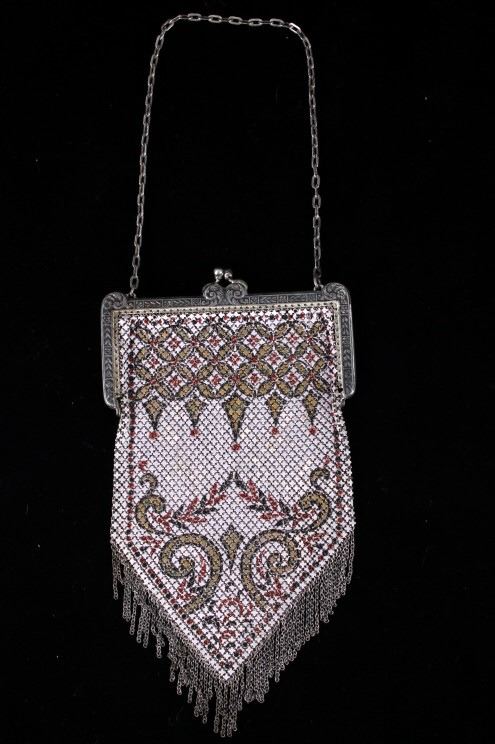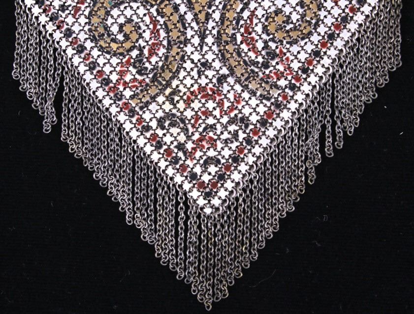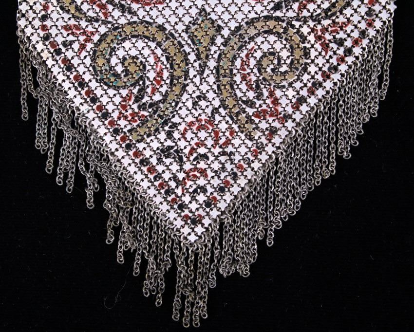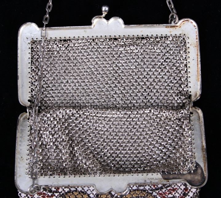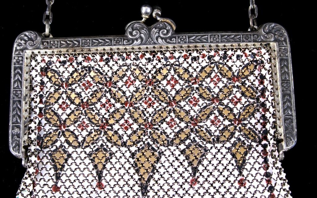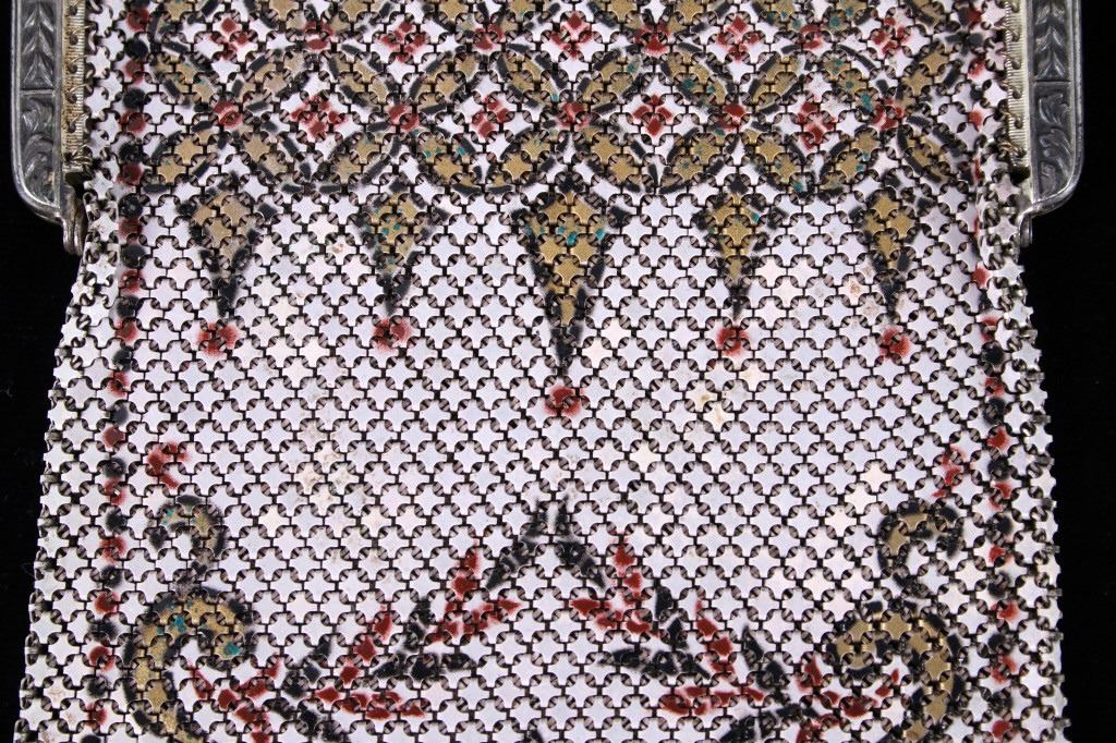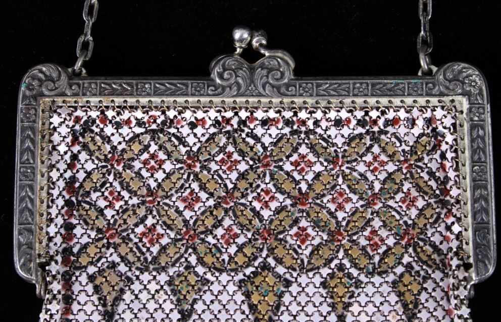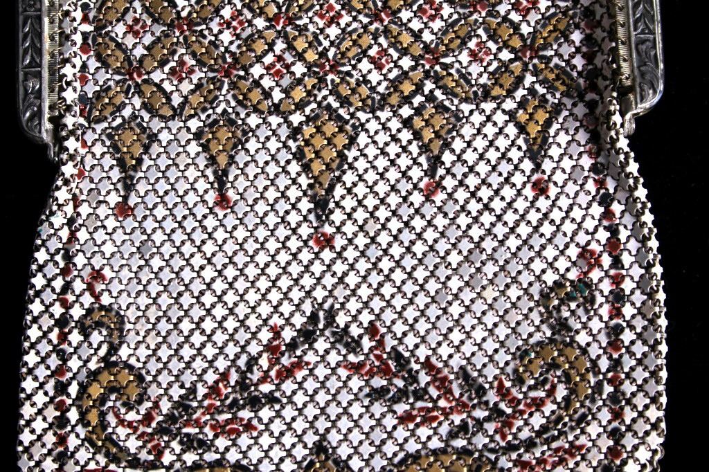 Featured in this lot is a antique Mandalian, Lamp Shade style design metal mesh purse with the patented "Lustro-Pearl" finish, circa 1920. Whiting & Davis and Mandalian "Flapper" styled purses were very popular in the 1920s and '30s. Mandalian are especially prized by collectors due to their quality and rarity, and are known for the vibrancy of their colours even after one hundred years have elapsed since their manufacture. Many collectors consider the enamelling on Mandalian bags as superior to other makes. Some collectors state that connecting ‘spiders’ are stronger & thicker than the other brands of this time which means they are more sound & less likely to break.