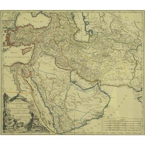 An Original Map of Etats du Grand - Seigneur en Asie Empire de Perse, Pays des Usbecs, Arabie et Egypte made by DE VAUGONDY matted at the sizes 26 1/2'x24' dated 1753 Information: Reissue of Hessel Gerritsz map Source: From Atlas Novus Condition : Full originalcolor; Large cartouche& Scale with gold highlights References: Pedle, M.S.389 Region : Asia: Ottoman Empire Catalogue: Garwood & Voight: Antique Maps - Catalogue130; Summer 2001 Item Number: 559 AMPR volume: 2001-2002