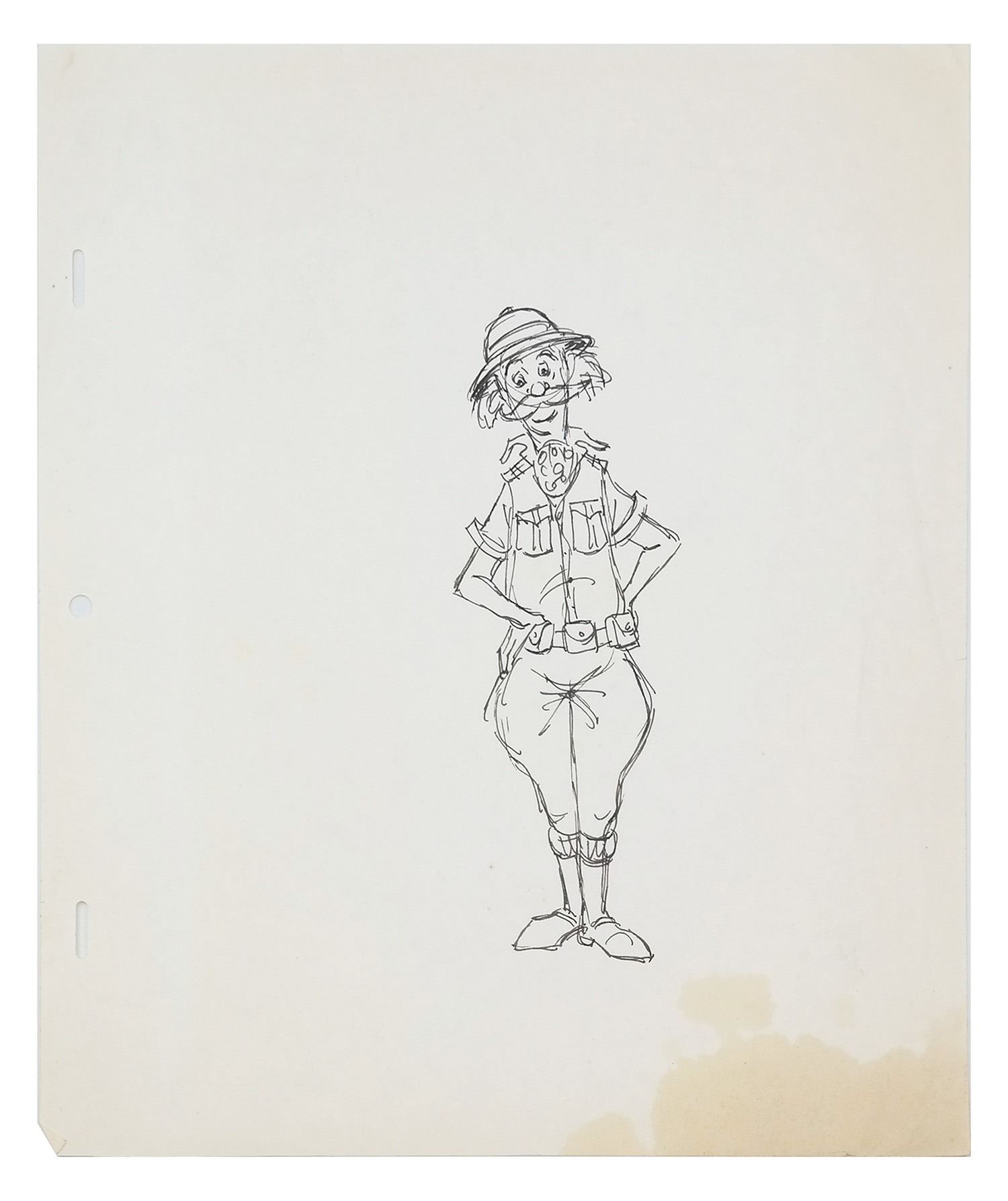 (Walt Disney World, c.1970s) An original concept drawing of an explorer for the Jungle Cruise. This drawing is ink on 3-hole animation paper and is attributed to Imagineer Marc Davis. The drawing belonged to Davis' companion and fellow Imagineer, Clem Hall. The image size is 7"x2.5" on the 12"x10" paper. The condition is good overall, with a few creases and a portion of staining in the bottom-right corner that doesn't touch the drawing.